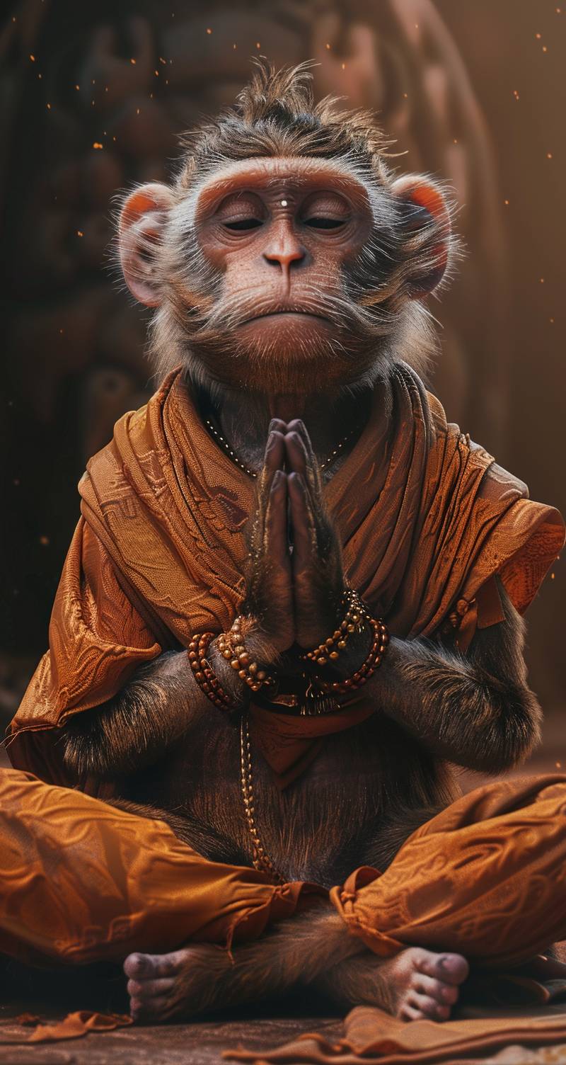 一隻穿著僧侶服裝的猴子,雙手合十,盤腿打坐,以迪士尼皮克斯的風格,卡通、可愛、電影鏡頭、超寫實。