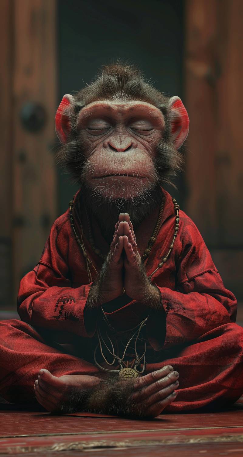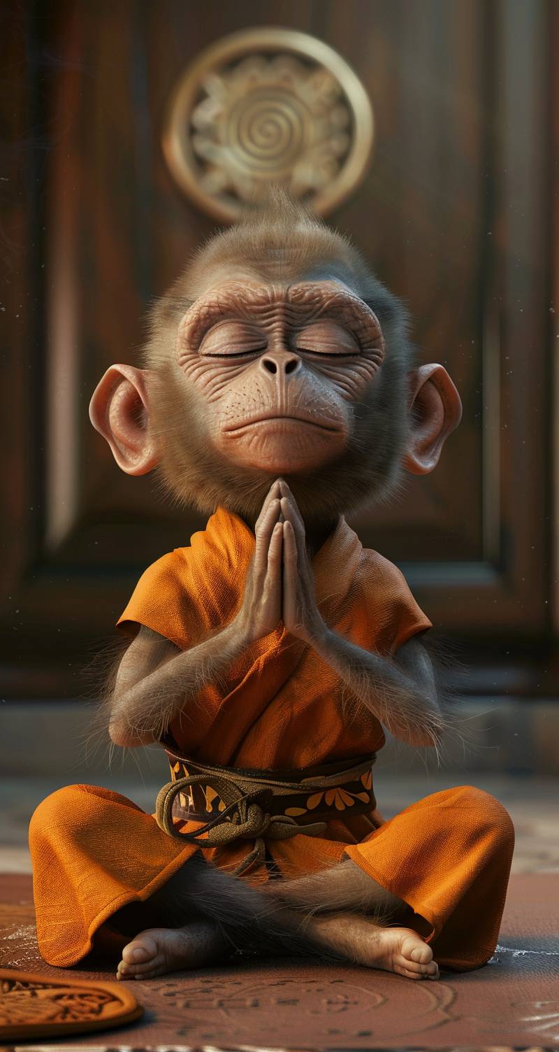 一隻穿著僧侶服裝的猴子雙手合十,盤腿冥想,風格為迪士尼皮克斯,卡通風格,極其可愛,電影級鏡頭,高度逼真。