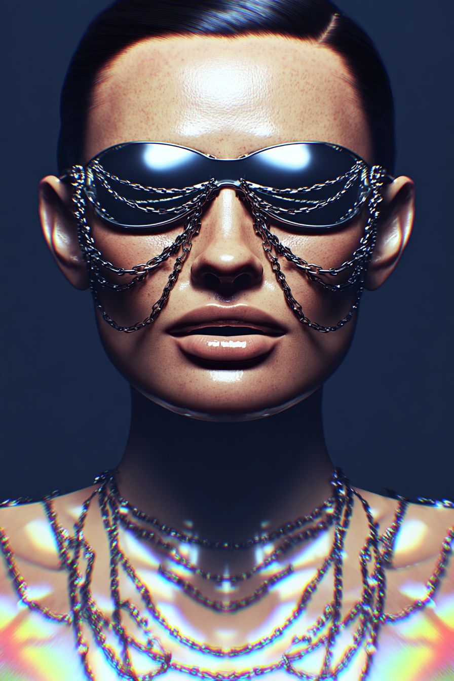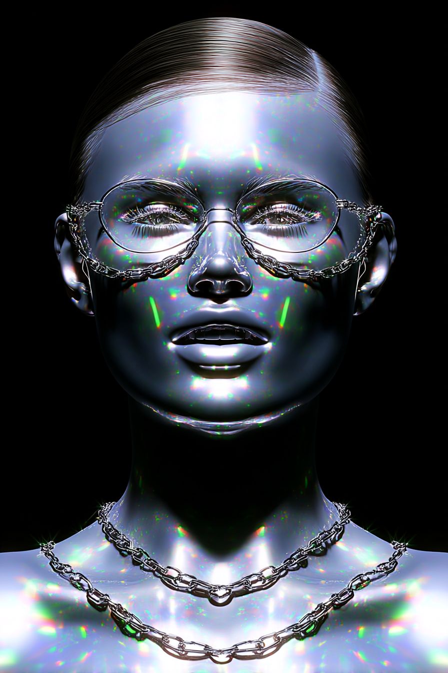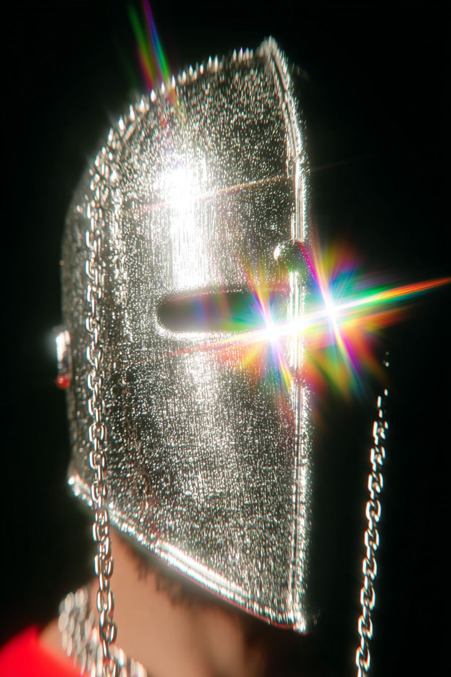 close-up portrait of a futuristic humanoid wearing a reflective chrome mask with chains and prismatic light flares, high-fashion photography, dark minimalist studio background, cinematic Apple-style lighting, elegant composition, glossy metallic textures, soft shallow depth of field, glowing rainbow reflections on the surface, premium editorial aesthetic, ultra detailed 8k render --chaos 75 --ar 2:3 --raw --weird 300 --s 50