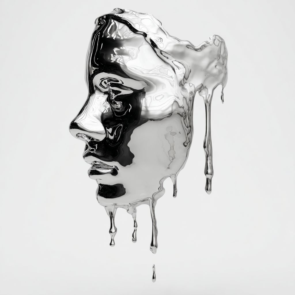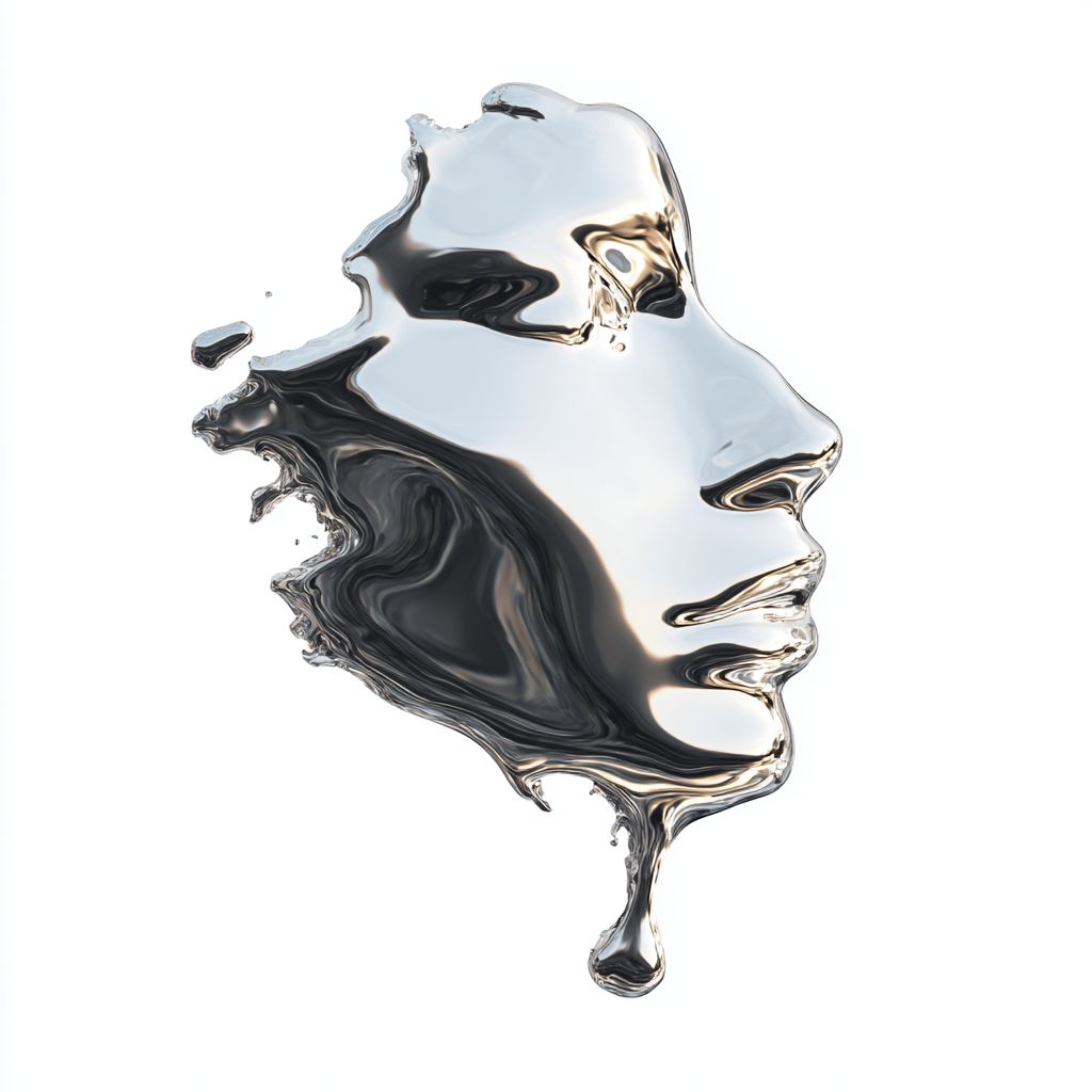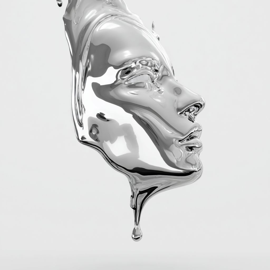 3d liquid chrome dripping and forming the shape of a woman's face, against a white background with no shadows, in a hyper-realistic style. --ar 1:1 --s 50 --raw