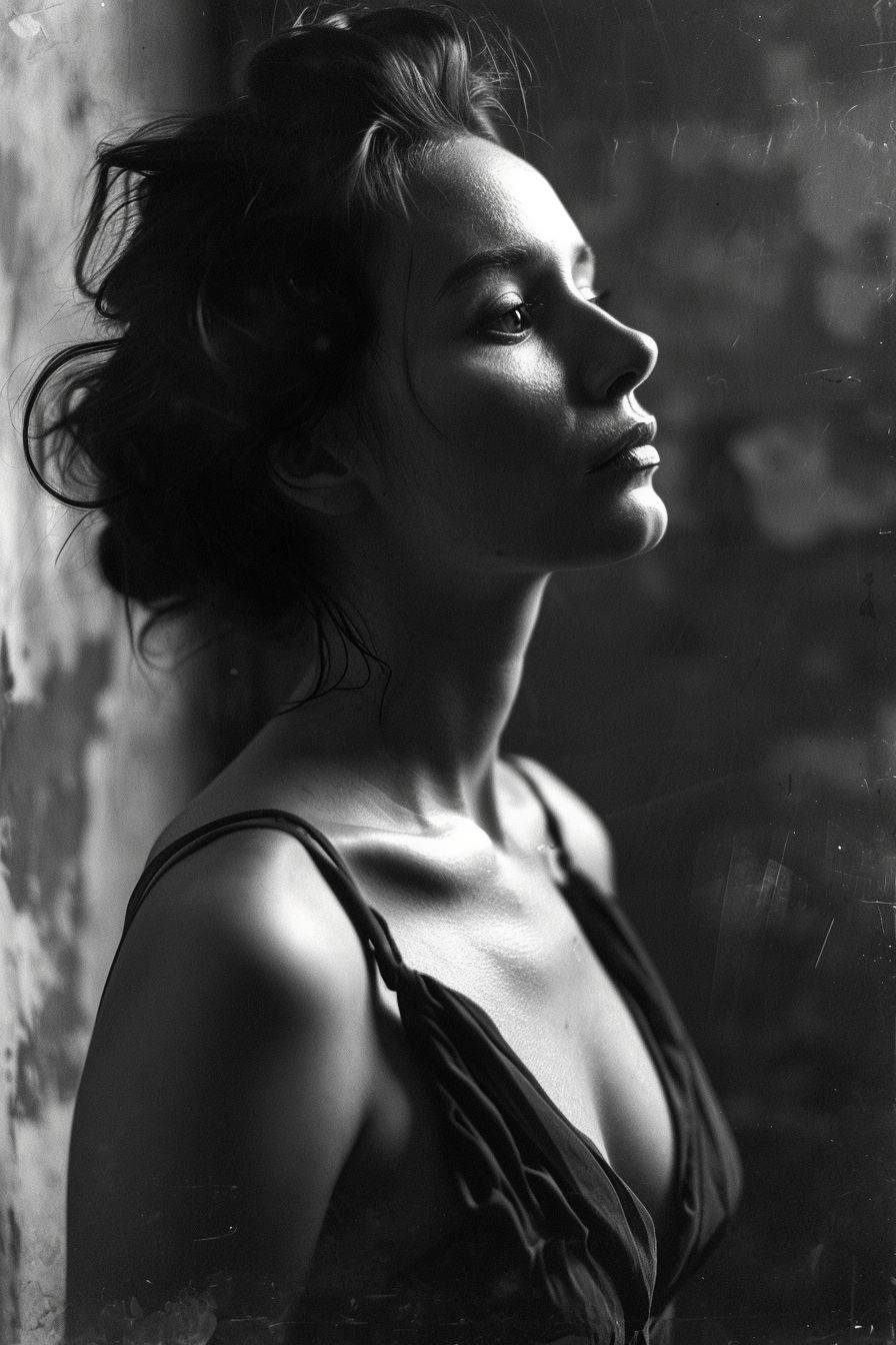 Black and white wet plate photo portrait of a woman in a sleek dress, silhouette emphasized through intense lighting and shadow juxtaposition, Pleasure and sensuality posing, abstract shadows in background --ar 2:3 --style raw --stylize 250 --v 6