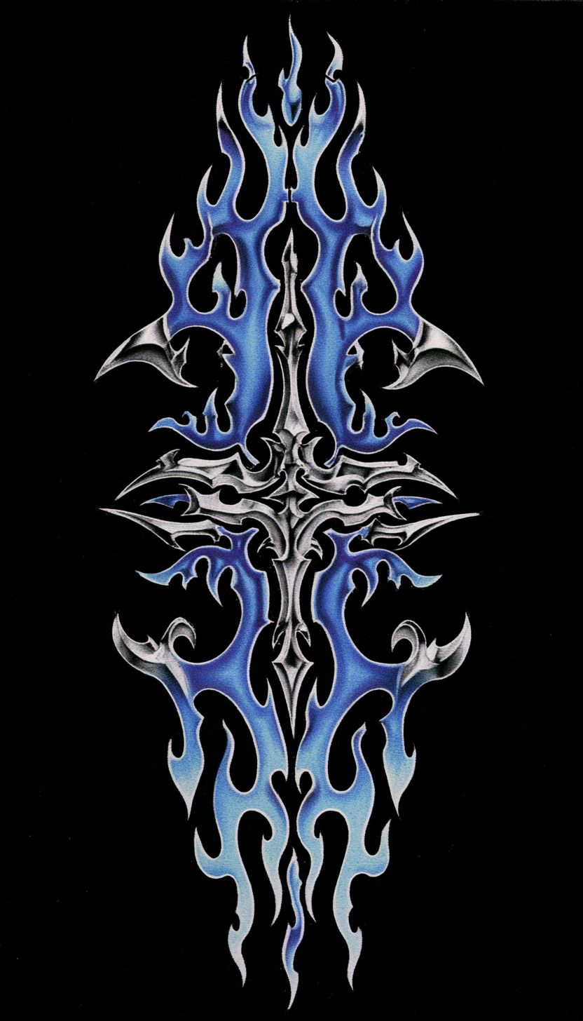 細長的垂直3D鉻質部落圖案,絲網印刷風格,無文字,黑色背景上