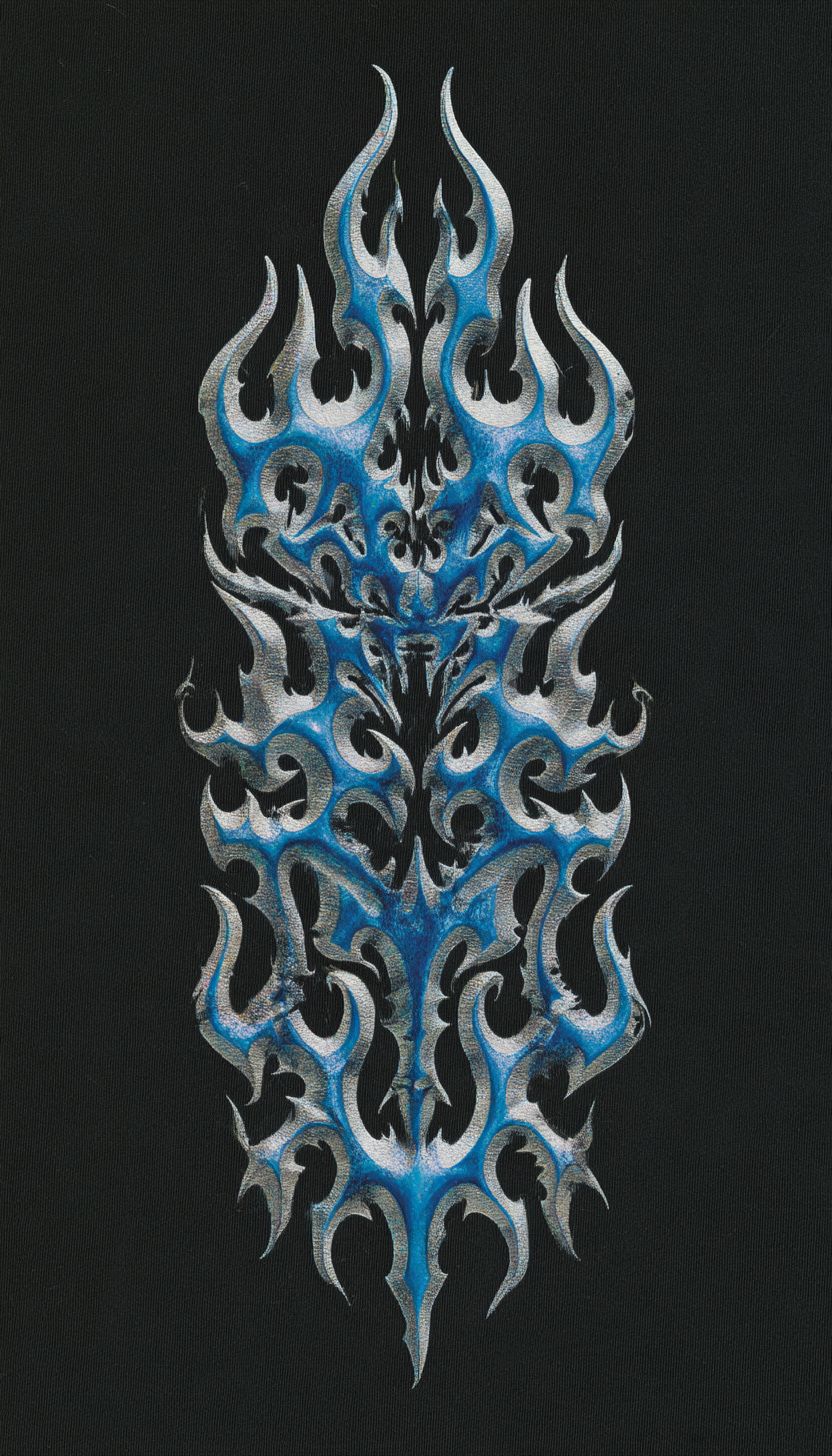 thin, vertical 3d chrome tribal pattern,screen printed style, no text , on plain black background --ar 4:7 --profile 9hs3h6a au5cihq --stylize 50 --raw