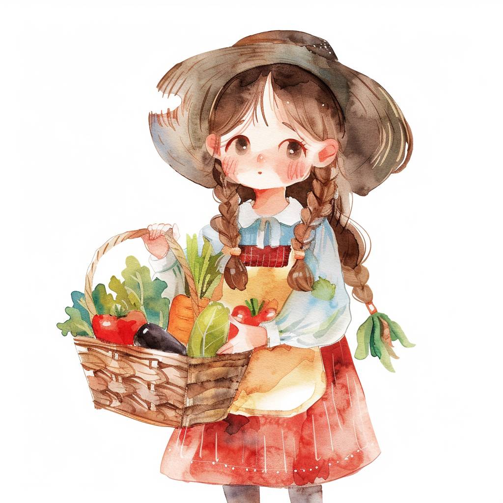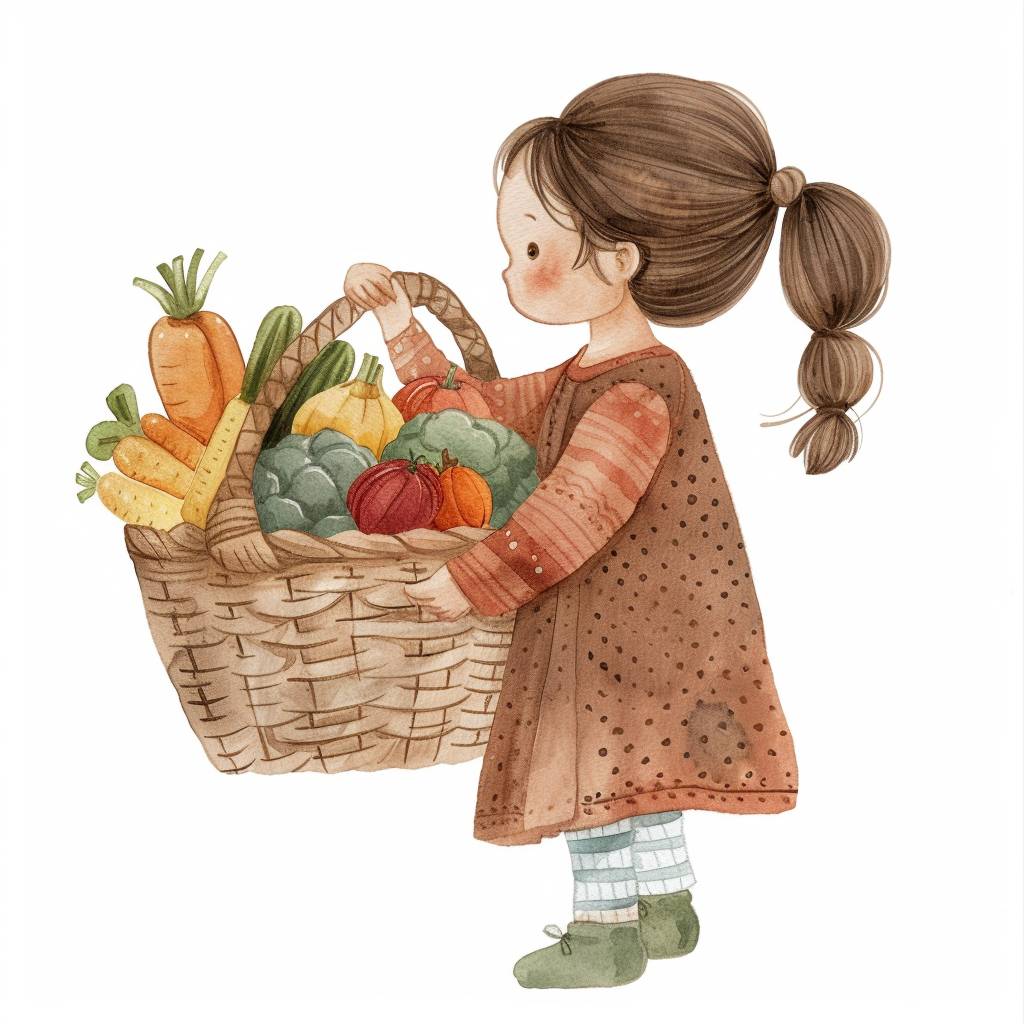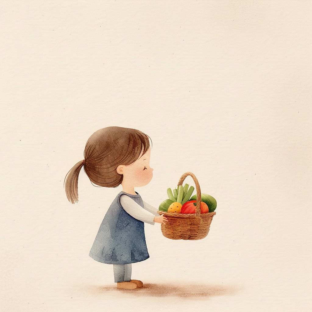 1717910265 watercolor, flat design, simple lines, simple shapes, hand drawn doodle by kestutis kasparavicius, the little girl is holding a basket of vegetable in her hand, --chaos 30 --ar 1:1 --v 6.0
