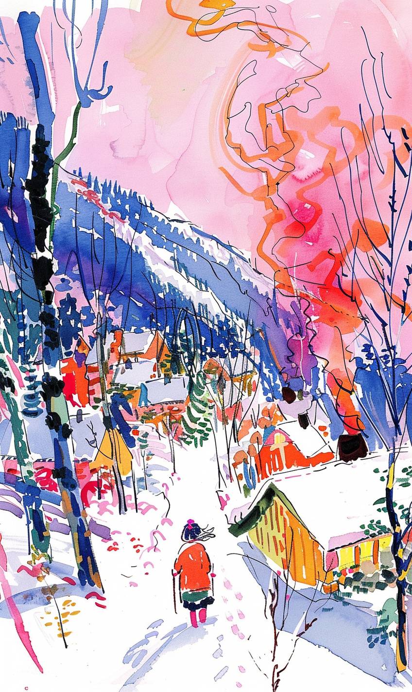A young girl in a snow-covered mountain village during winter, cozy wooden houses, smoke rising from chimneys, with soft twilight casting a magical glow --ar 3:5 --sref 57040263 --v 6.0