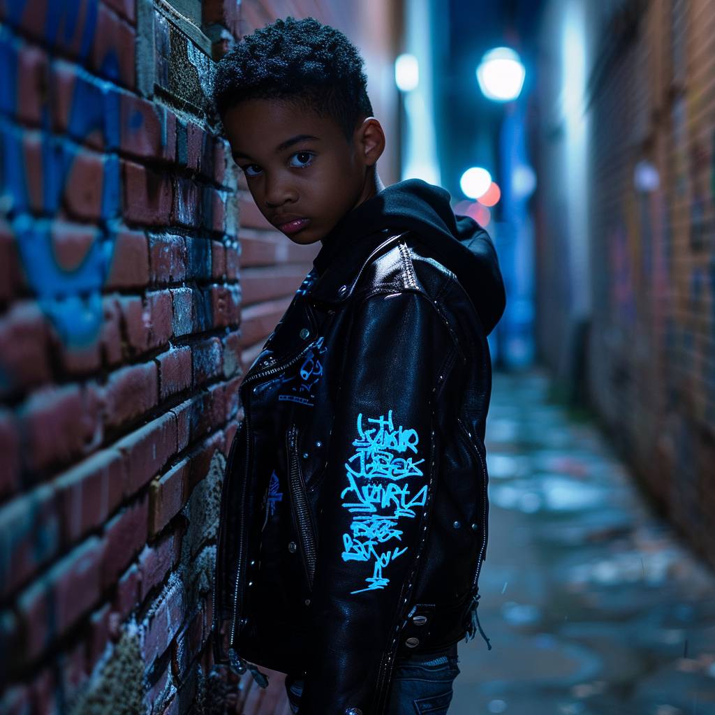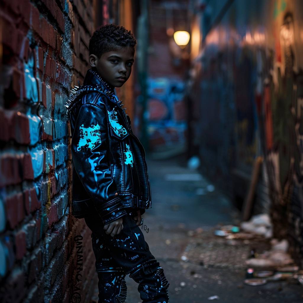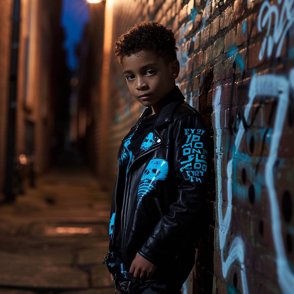 一個穿著黑色皮夾克的小男孩,夾克上有霓虹冰藍色塗鴉風格的補丁,靠在一個陳舊的磚牆上,周圍是一條昏暗的巷子,街燈閃爍的光線灑在他身上。牆面布滿了塗鴉,巷子裡充滿了陰影。模特的輪廓在街燈的光線下特別突出,營造出一種神秘與吸引力。模特正直視著鏡頭,神情自信。整體氛圍粗獷、城市化且叛逆。