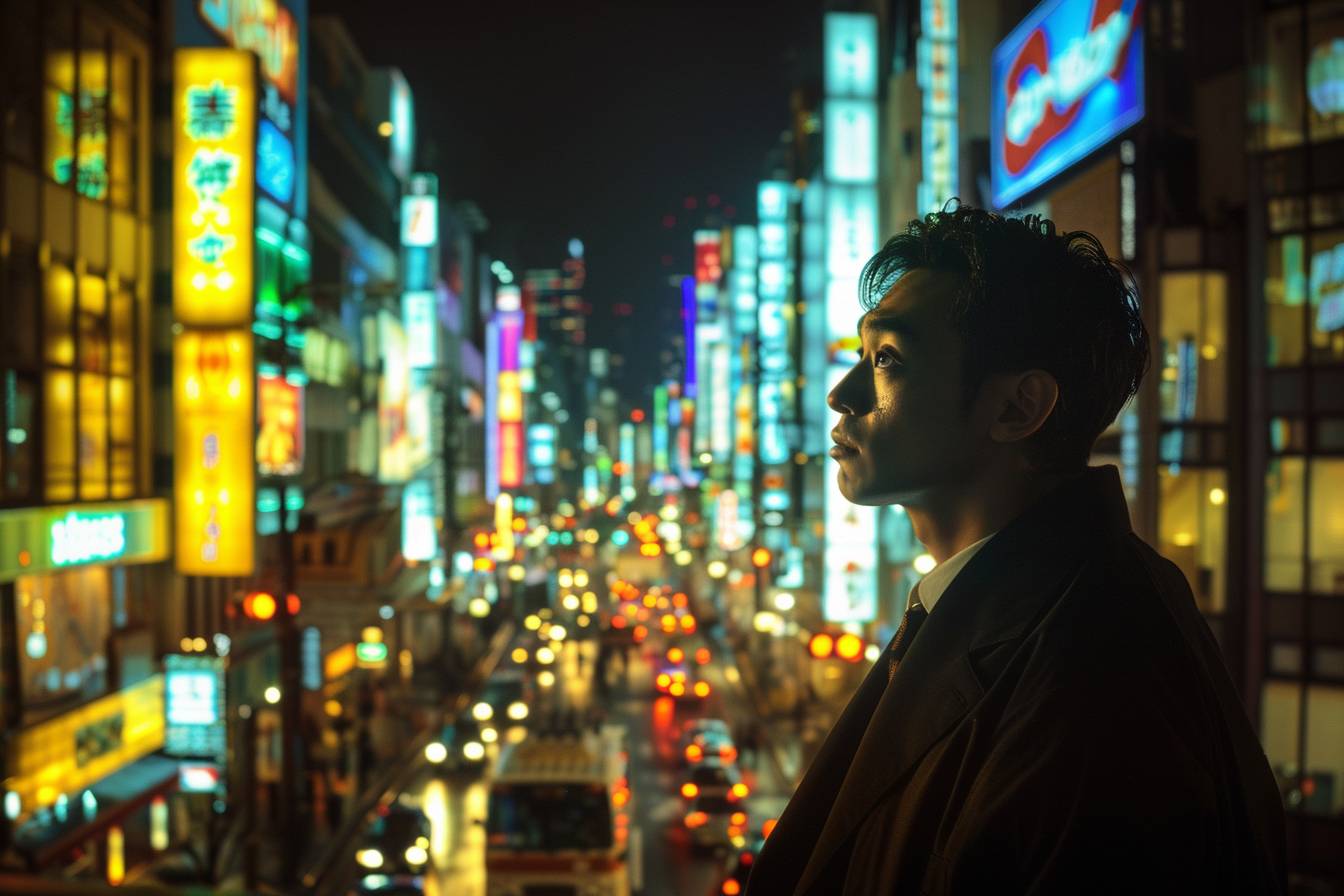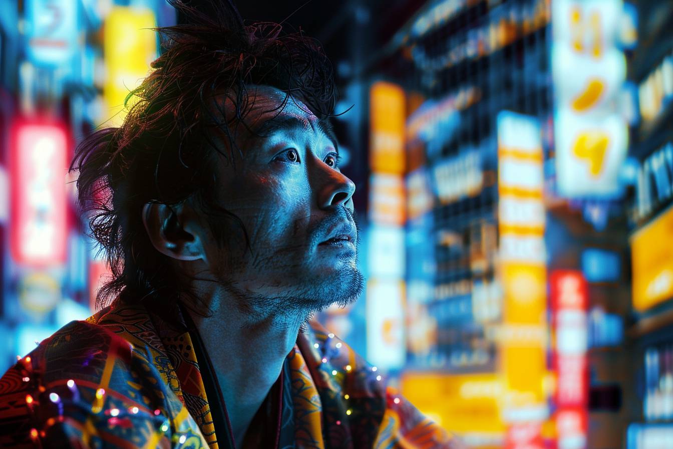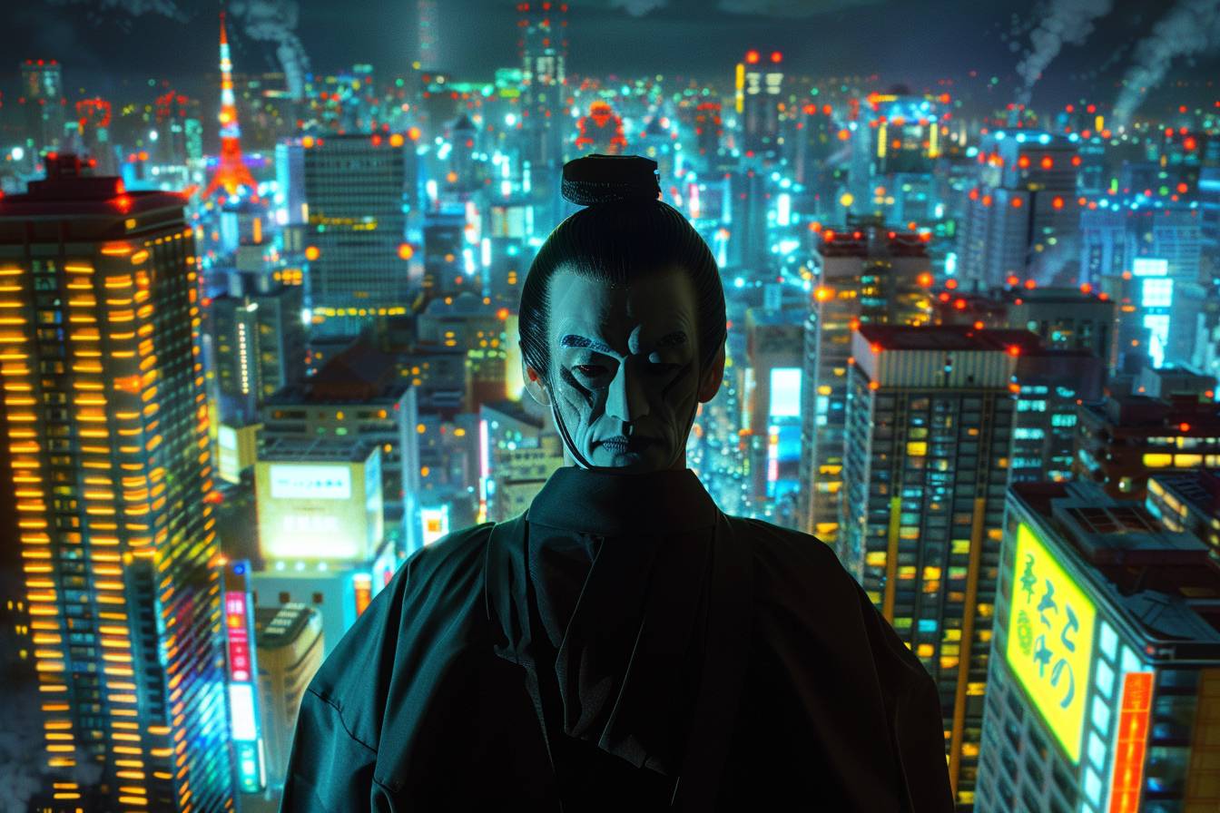 《霓虹夜曲》中的歌舞伎演員,沐浴在未來主義舞台聚光燈下輝煌的黃金光芒中,周圍是延伸至地平線的霓虹燈都市。