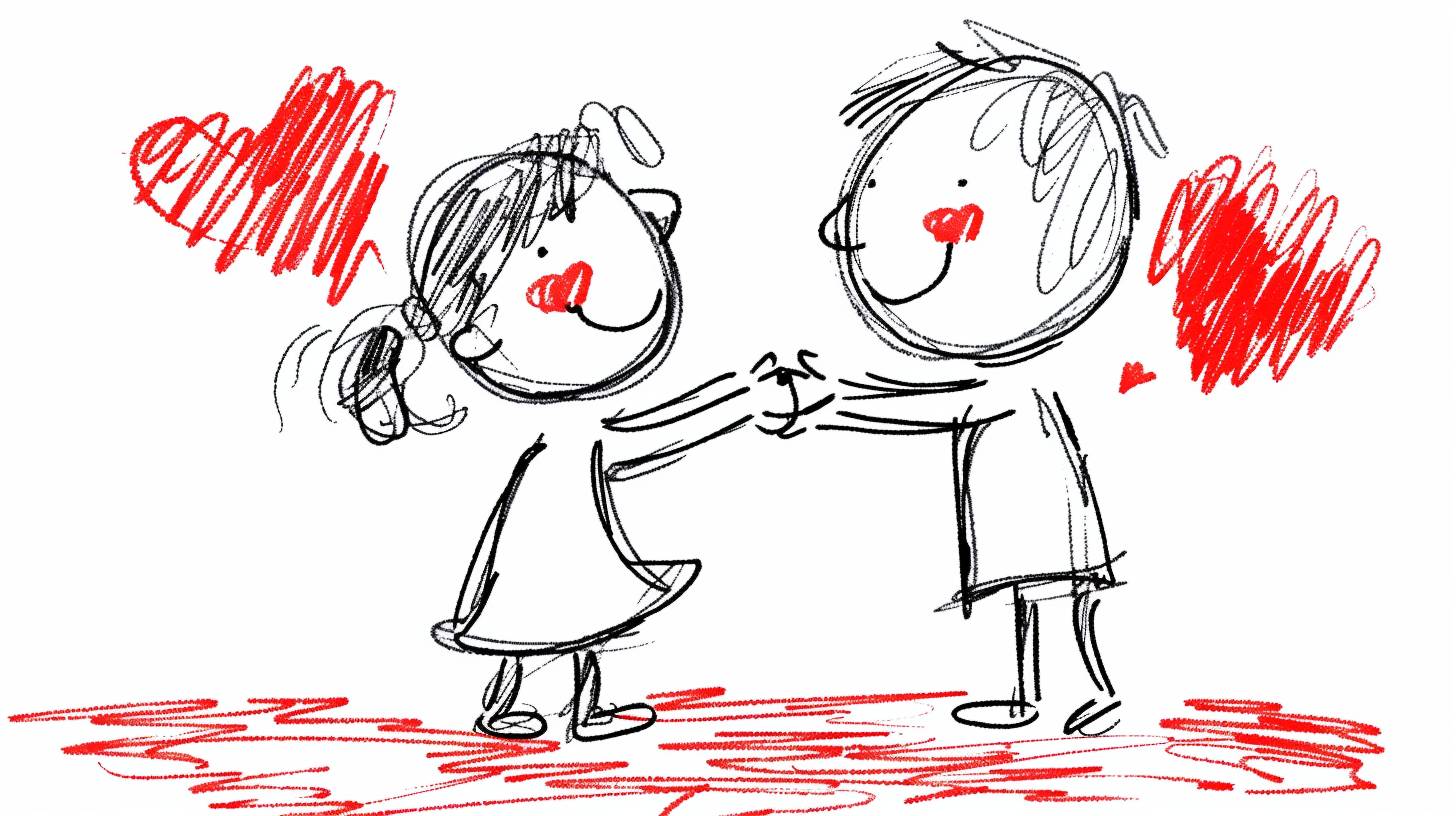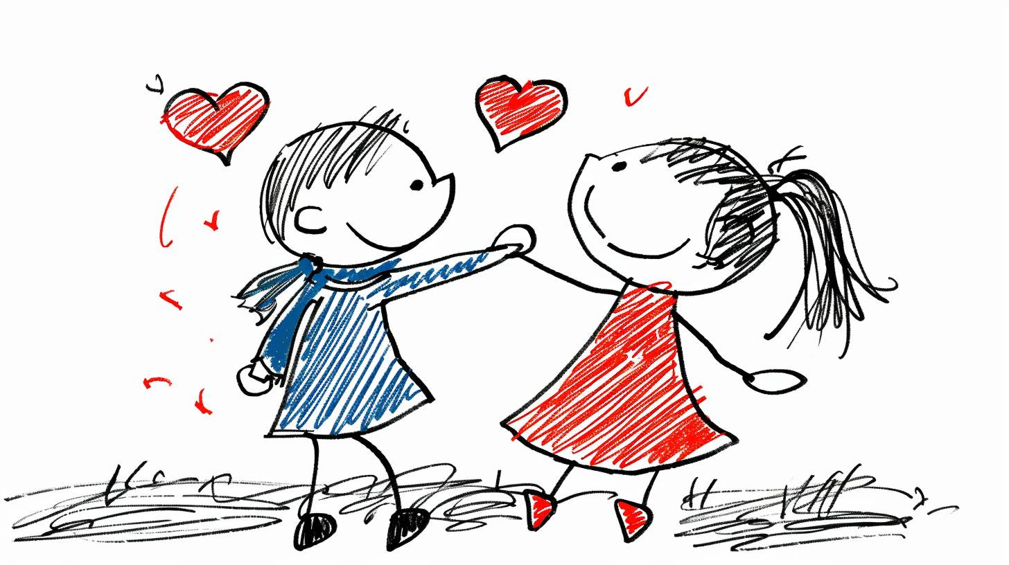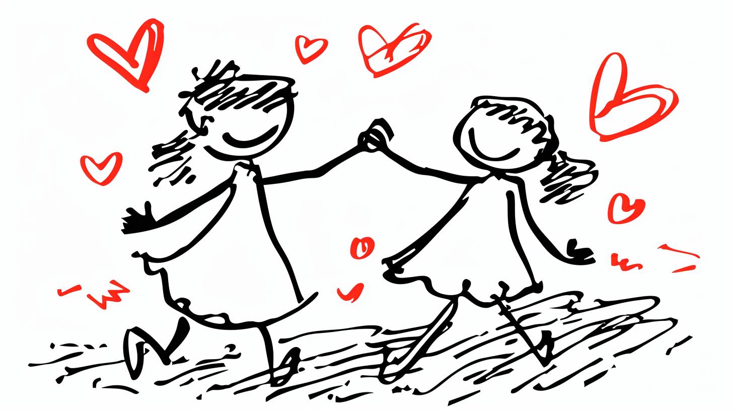 hand drawing cartoon style 2d stick figure of a loving couple dancing, hearts, very detailed, high quality --sref 4265911769 --ar 16:9 --v 6.0