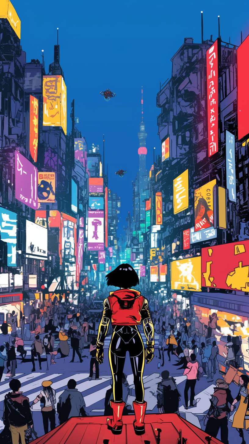 Cortana在霓虹燈閃爍的賽博朋克城市中,融入人群,氣氛緊張而前衛。