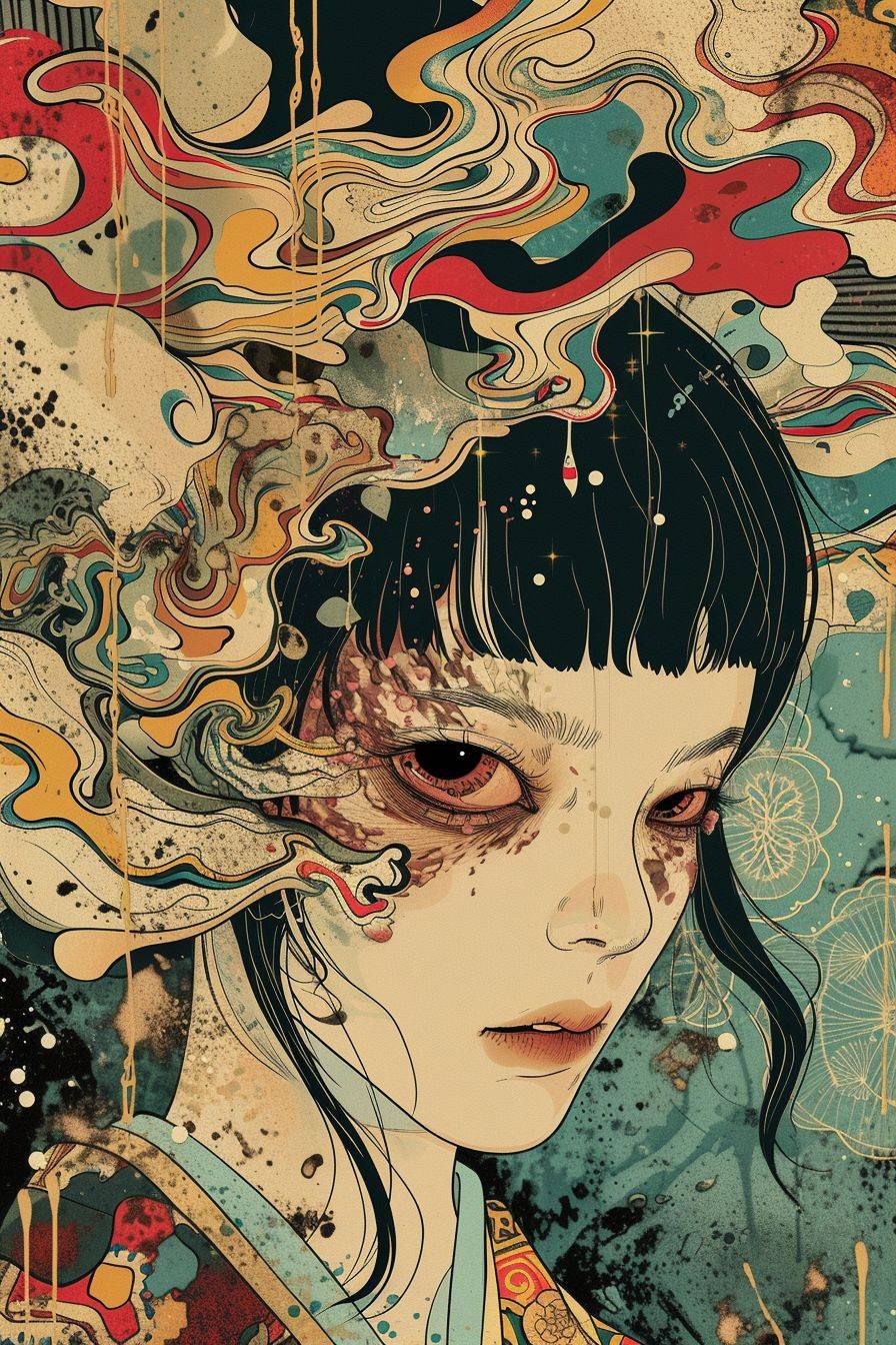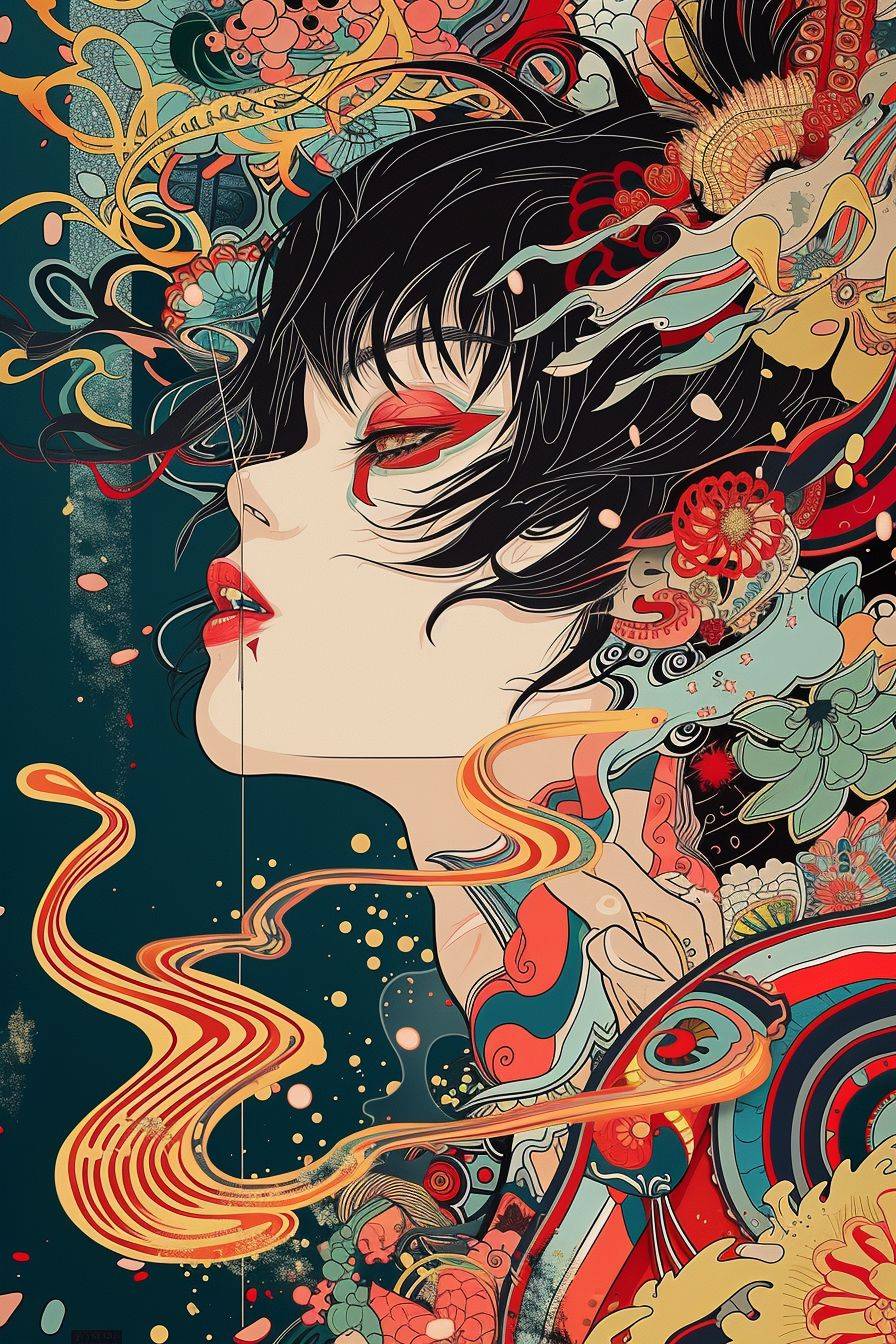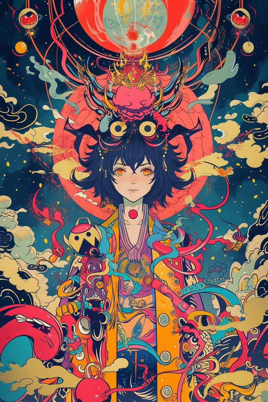 復古動漫角色海報,帶有分形圖案和迷幻元素