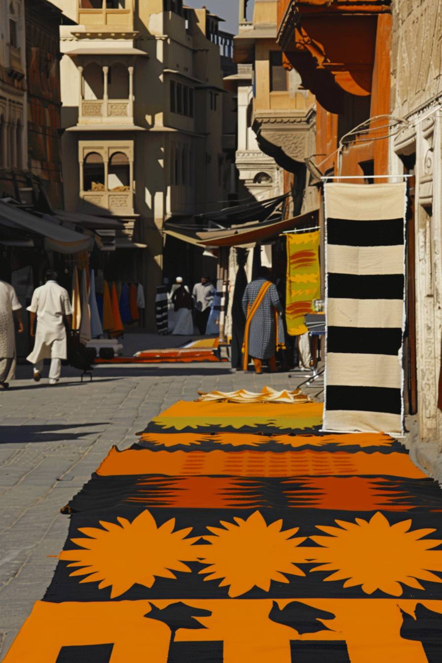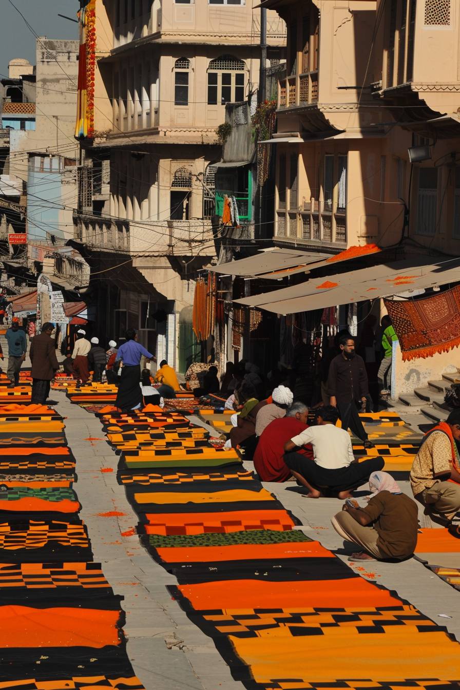 一個繁忙、色彩繽紛的街頭市場,位於一個異國他鄉,裡面有鮮艷的布料、芳香的香料和熱鬧的商販。