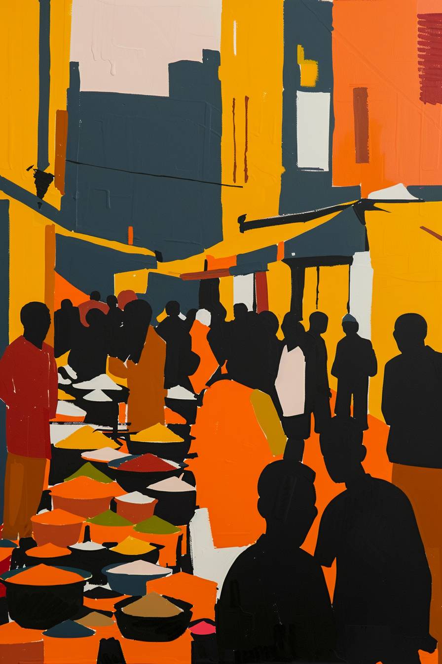 一個繁忙多彩的街市,充滿異國情調,布料鮮艷,香料馥郁,交易熱鬧。
