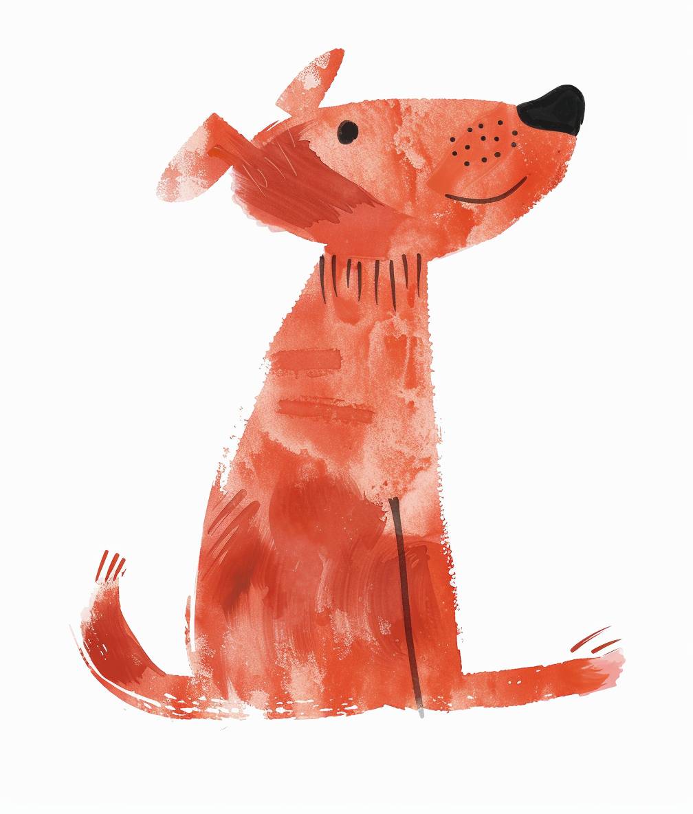 可愛的紅色狗,簡單的線條,水彩紋理,兒童書籍插圖風格,扁平設計,高分辨率,白色背景,淺色,明亮乾淨的圖片,風格類似於乔恩·克拉森。