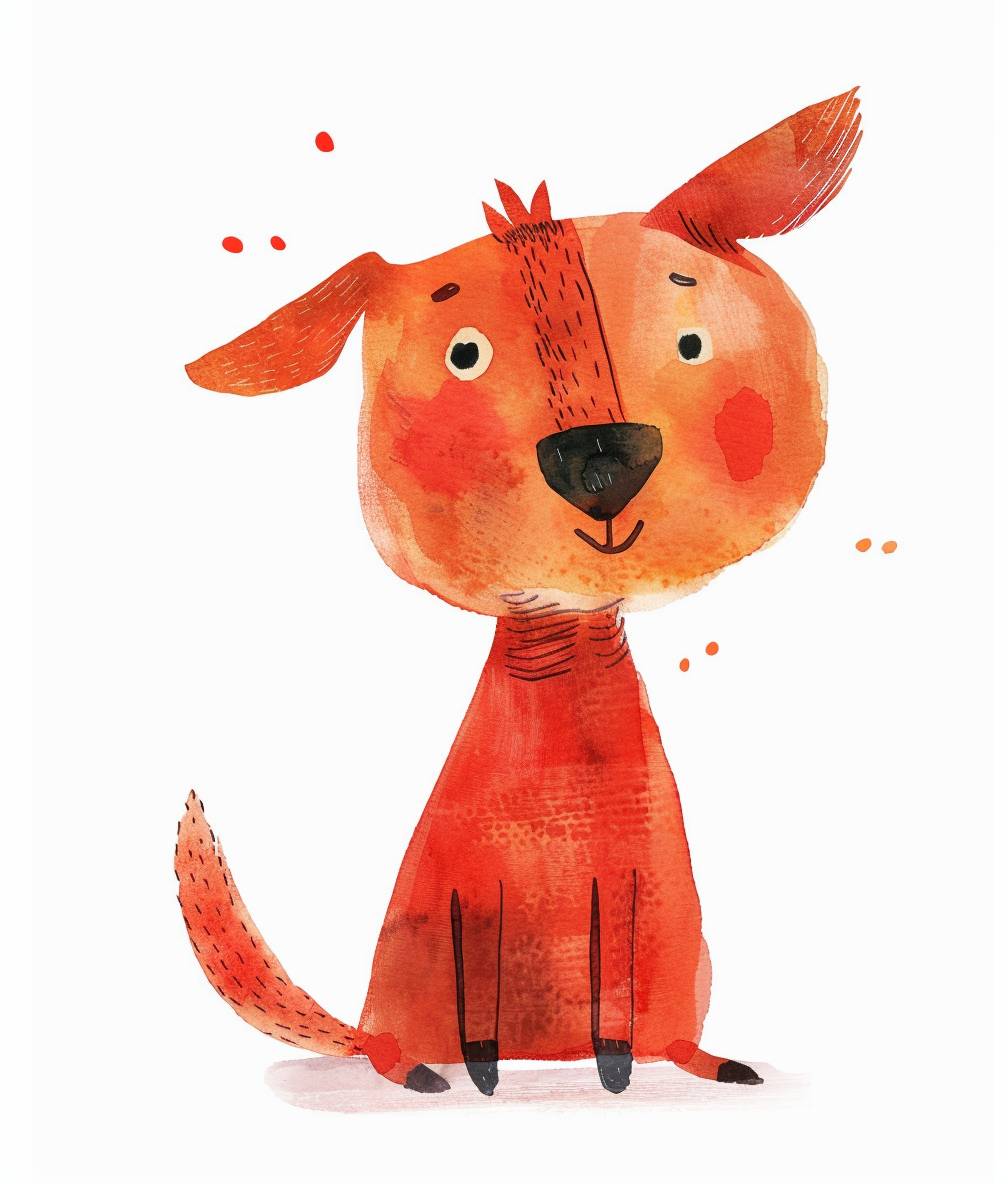 可愛的紅狗,簡潔線條,水彩質感,兒童書插畫風格,平面設計,白色背景,明亮乾淨的圖片。