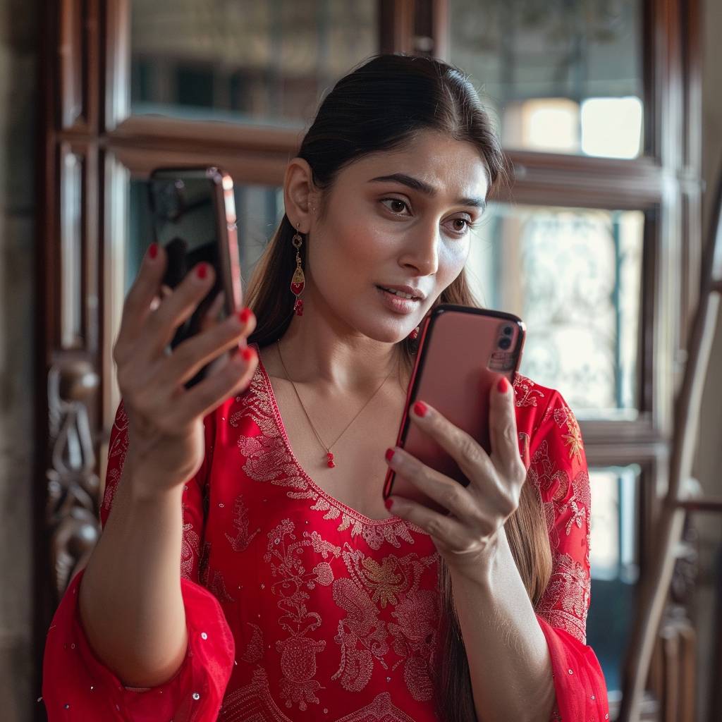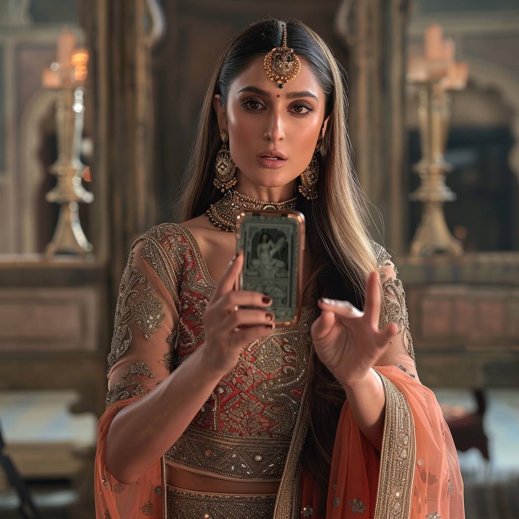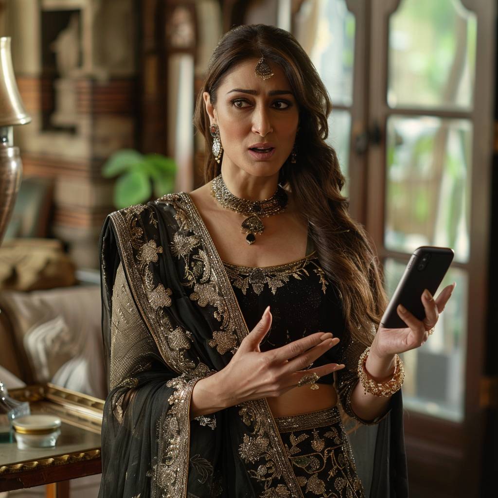 indian actress kareena kapoor is holding a phone in one hand which is facing front and she is pointing toward phone from other hand,--ar 9:16 --v 6.0