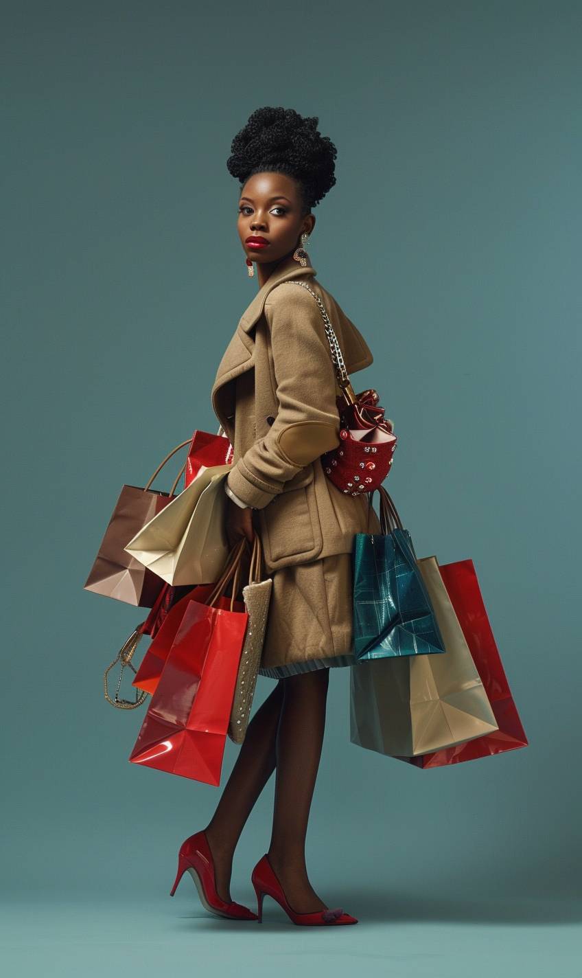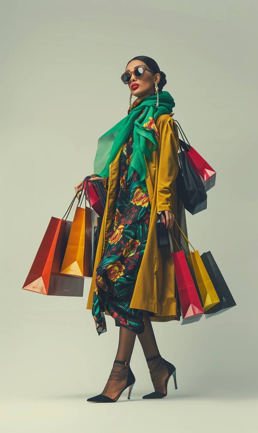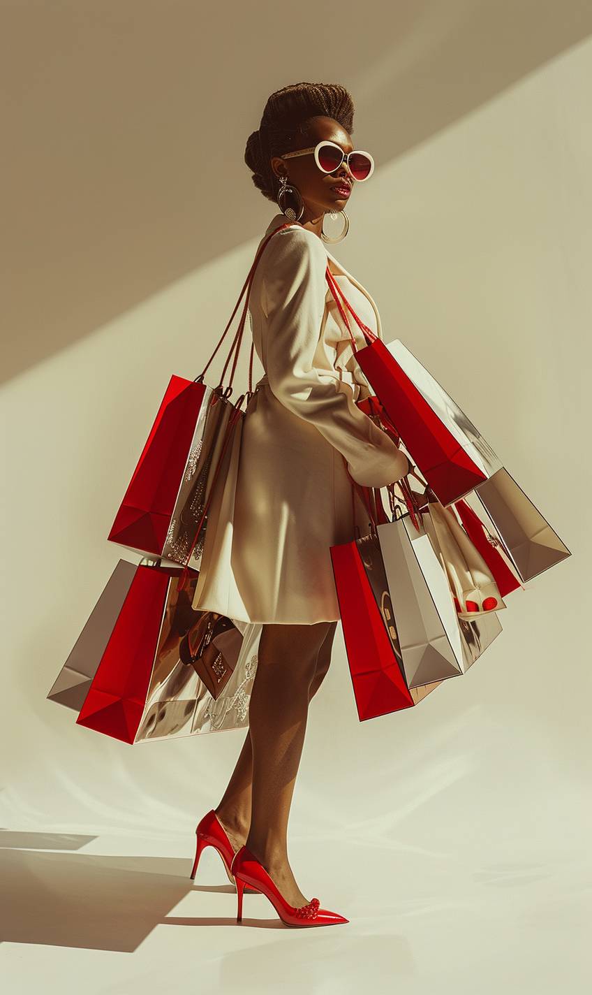 A hero image showing a glamorous, fashion-forward woman as a shopping addict. She is standing full, high heels and carrying an array of shopping bags, dressed in stylish and elegant clothing. The background is solid and minimalistic, ensuring plenty of space for text. Shot with a wide-angle lens to capture the entire scene. --ar 3:5 --v 6.0