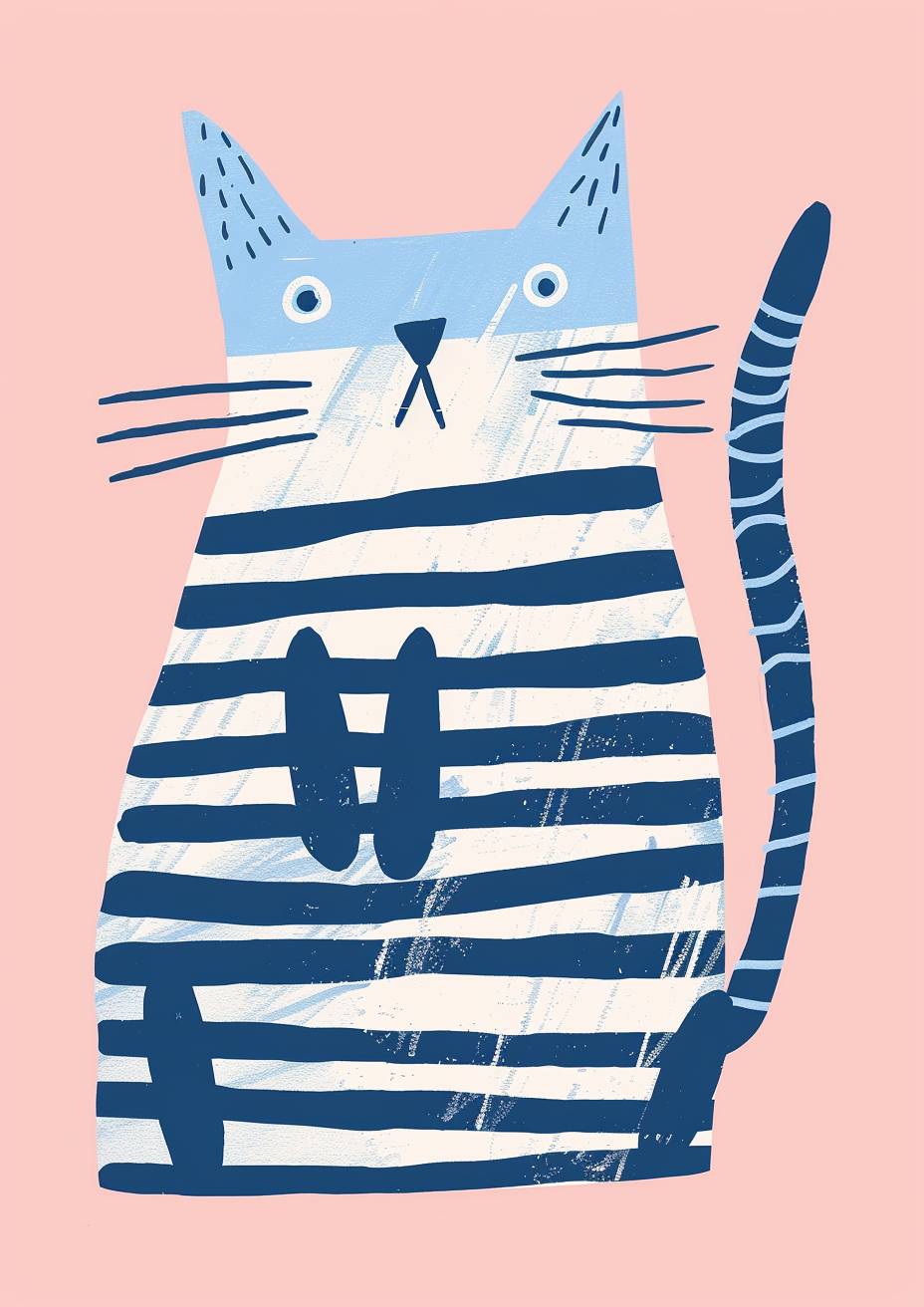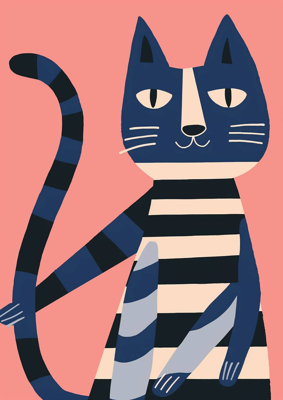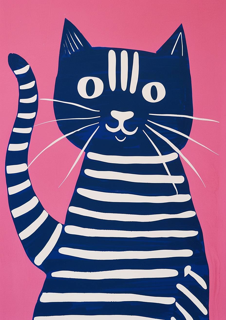 一幅極簡主義的貓畫,大藍白條紋背景為粉紅色,風格受亨利·馬蒂斯影響。設計簡單卻充滿趣味,粗線條勾勒出輪廓。貓用一隻手握著像身體一樣有條紋的尾巴,展現出一種隨時可能跳躍的動感。使用了簡單的形狀。