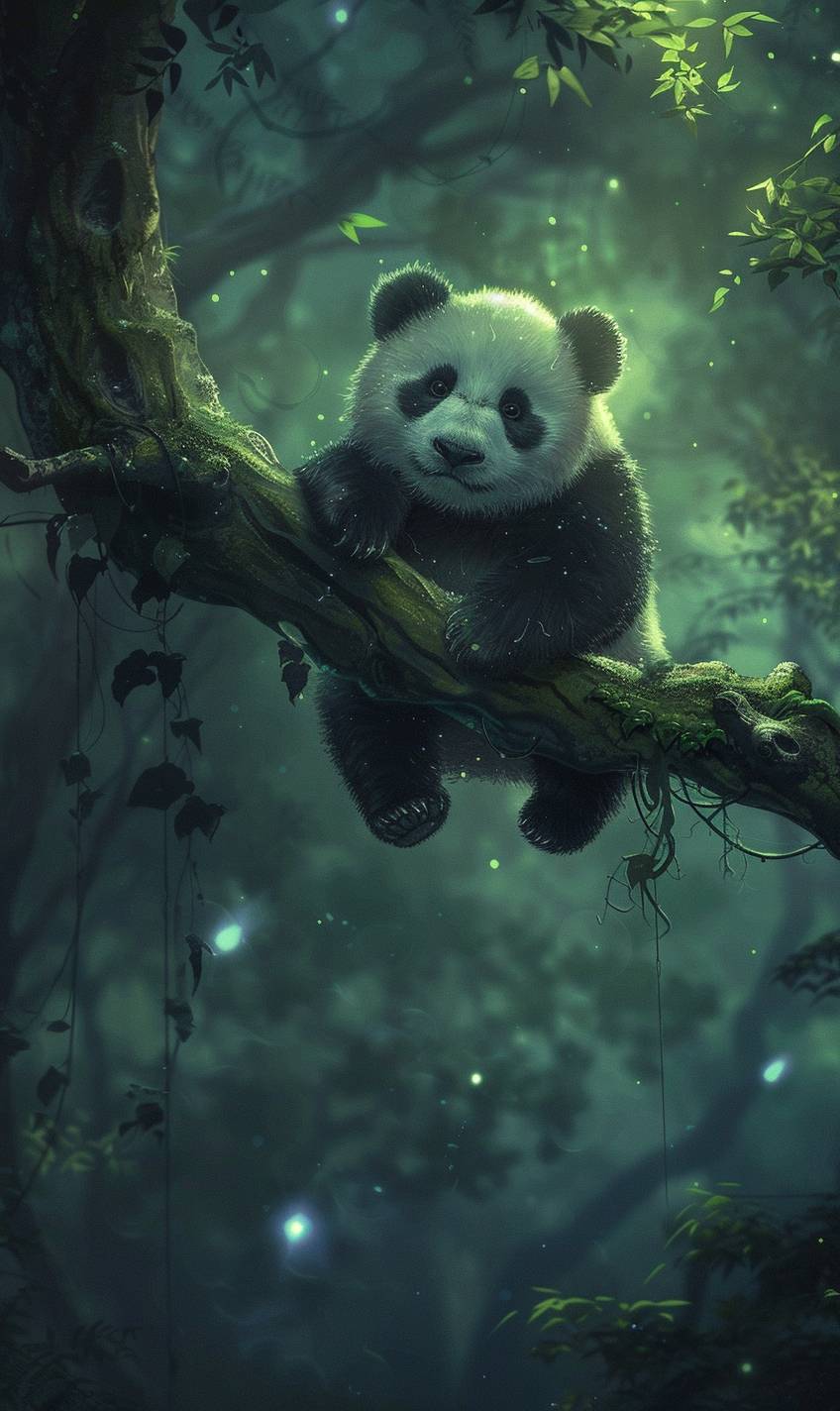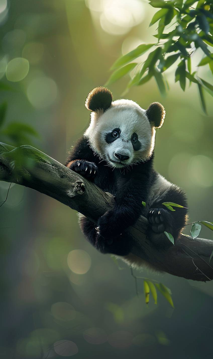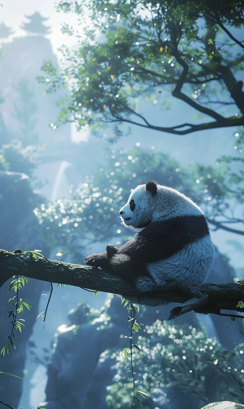 A panda is sitting on a branch. It is a very cute panda's back. It is a very beautiful tree with a very long branch. The panda looks very leisurely, realistic photography, high Image quality, ultra-wide-angle light, 4K high-definition, volumetric light, bioluminescence, ultra-wide-angle, high-definition, --ar 3:5 --v 6.0