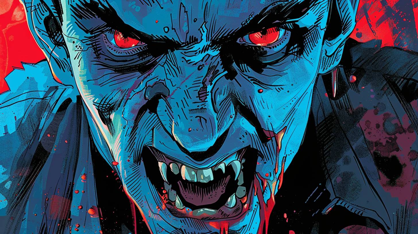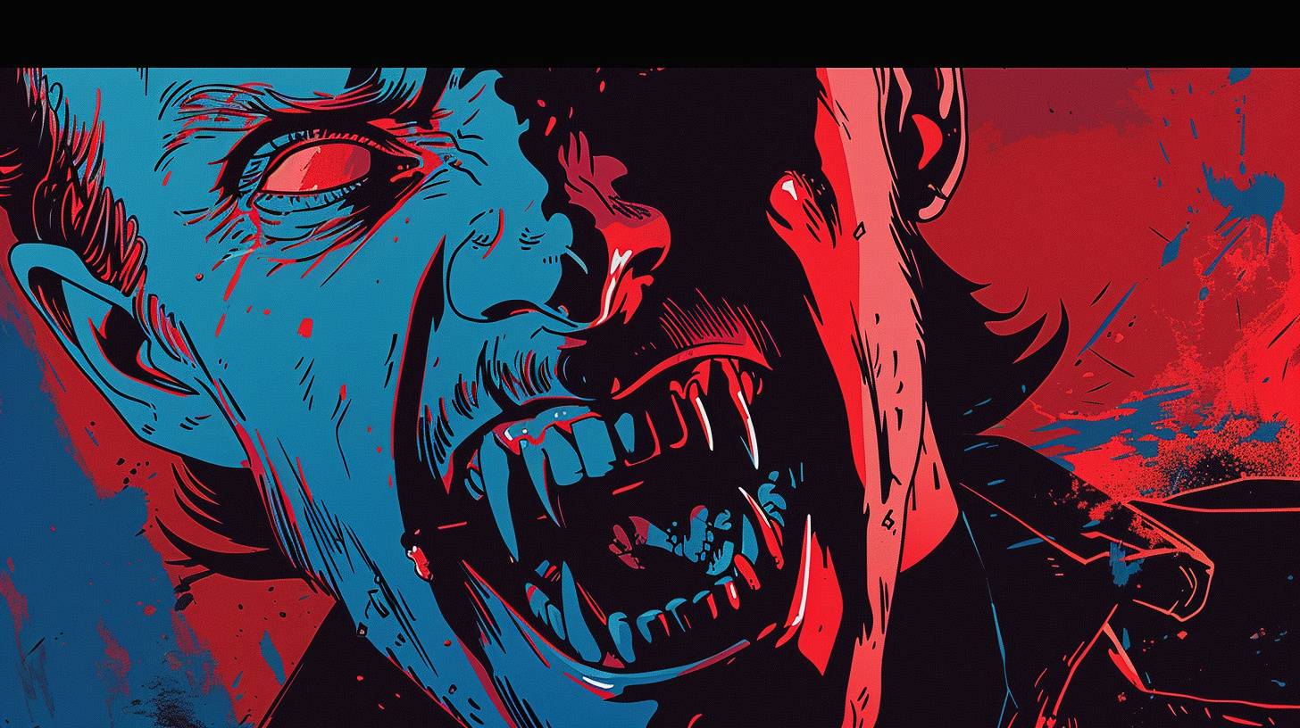 Close up of a vampire [creature] | fangs showing | Machinepunk | modern flat SVG Moebius pulp comic art | low saturation cyan and garnet colors --s 150 --v 6.0 --ar 16:9