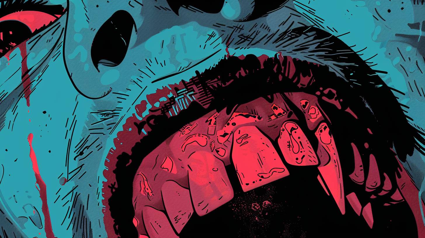 吸血鬼的特寫【生物】| 牙齒暴露 | 機械朋克 | 現代扁平SVG莫比烏斯紙漿漫畫藝術 | 低飽和度青色及石榴色