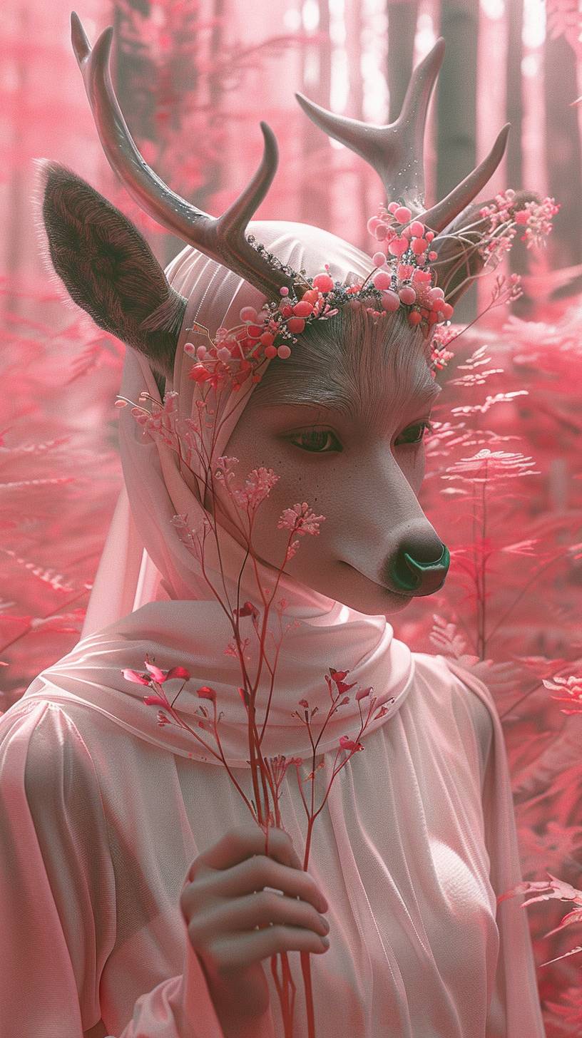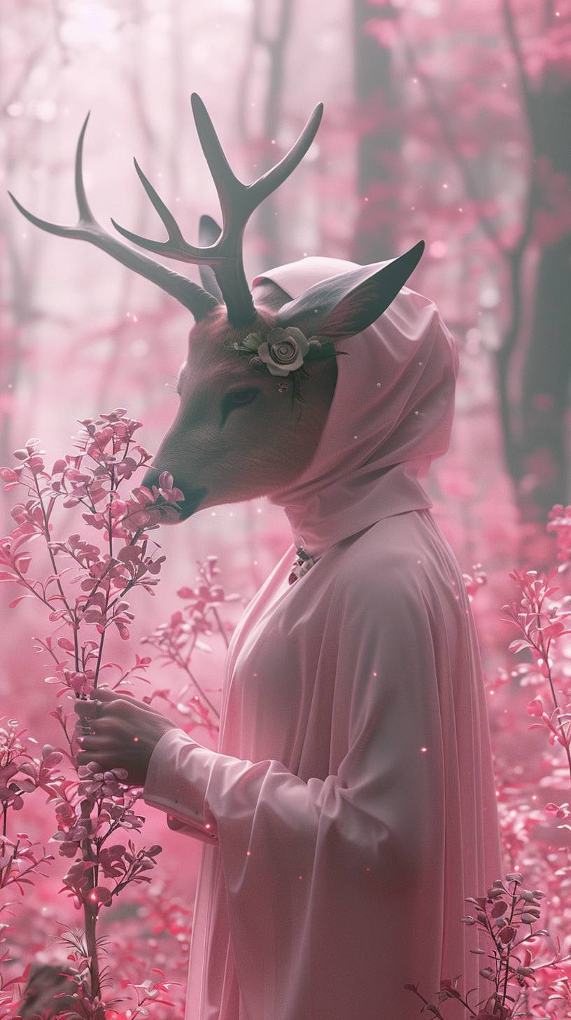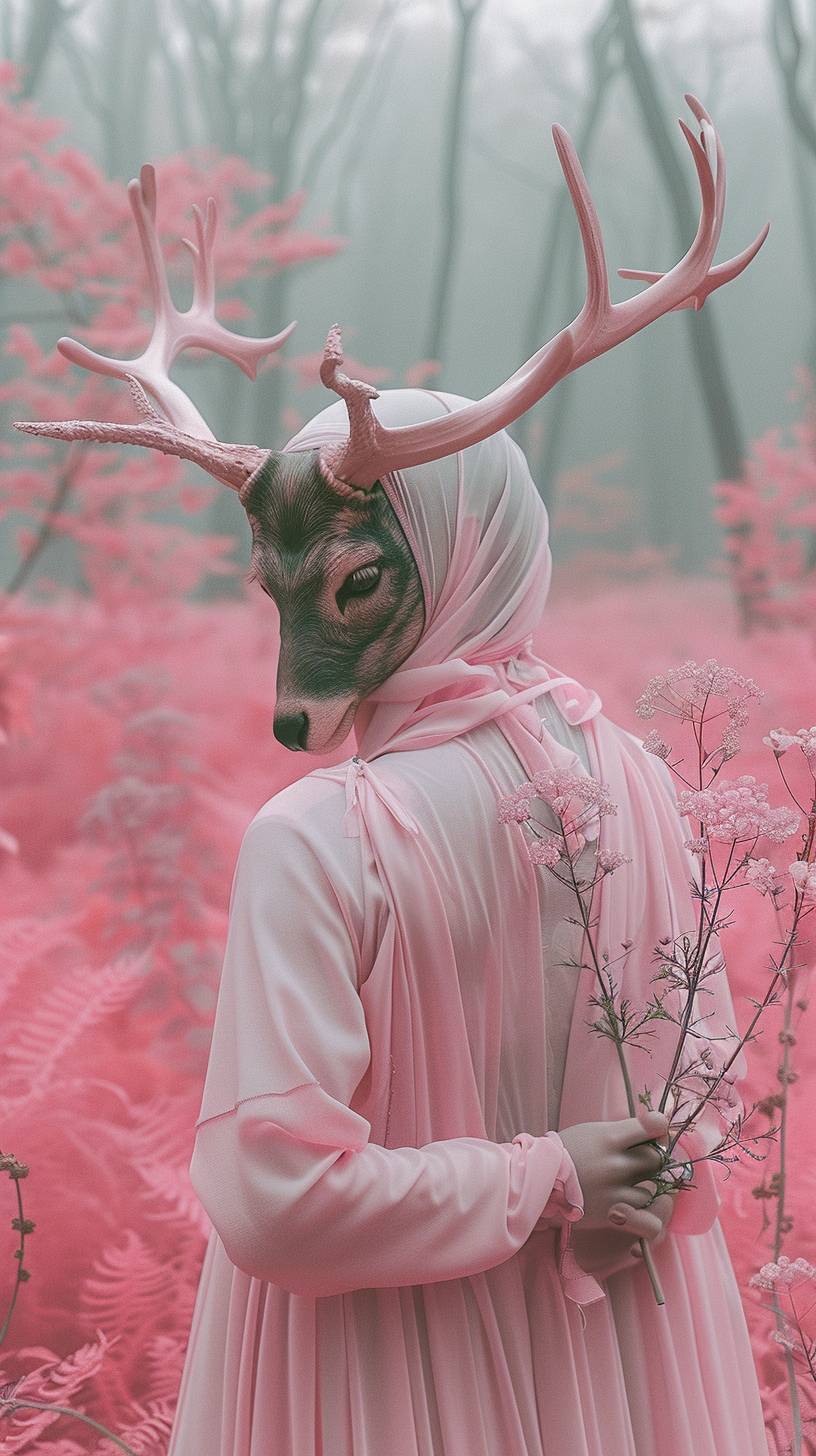 <https://s.mj.run/nniKxoafefg> Conceptual art, in a pink forest, a woman with a deer head holding flowers in a plant, looking towards the camera. It is strange, complex, but infused with a terrifying romance, with soft colors, Center the composition, Long Shot, Edge light, 8K Resolution, Photorealistic, In the morning mist, Surrealism --chaos 1 --ar 9:16 --style raw --stylize 750 --v 6.0