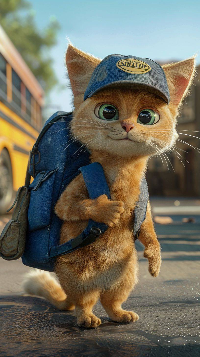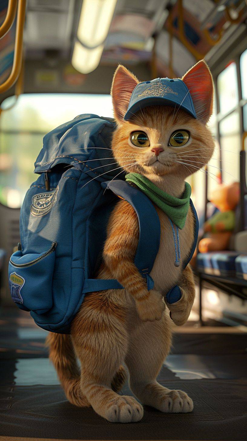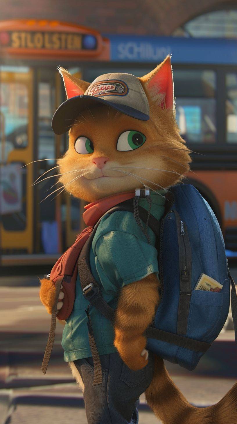 animated cat named William who wants to teach kids about riding the school bus safely. He has a ballcap and a blue backpack. --ar 9:16 --v 6