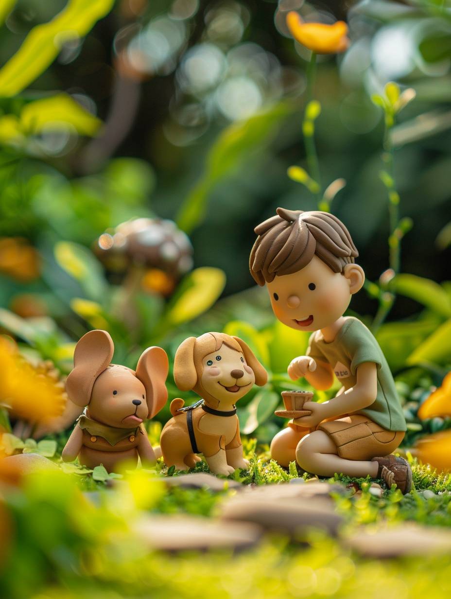 可愛的年輕情侶在草地上和他們的狗玩耍,休閒的,季節是夏天,物體和場景是由黏土製成的,具有黏土質感,定格動畫風格。