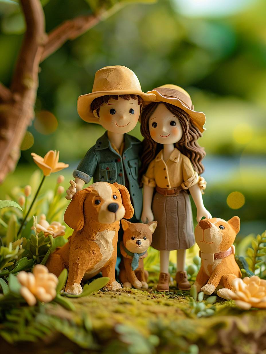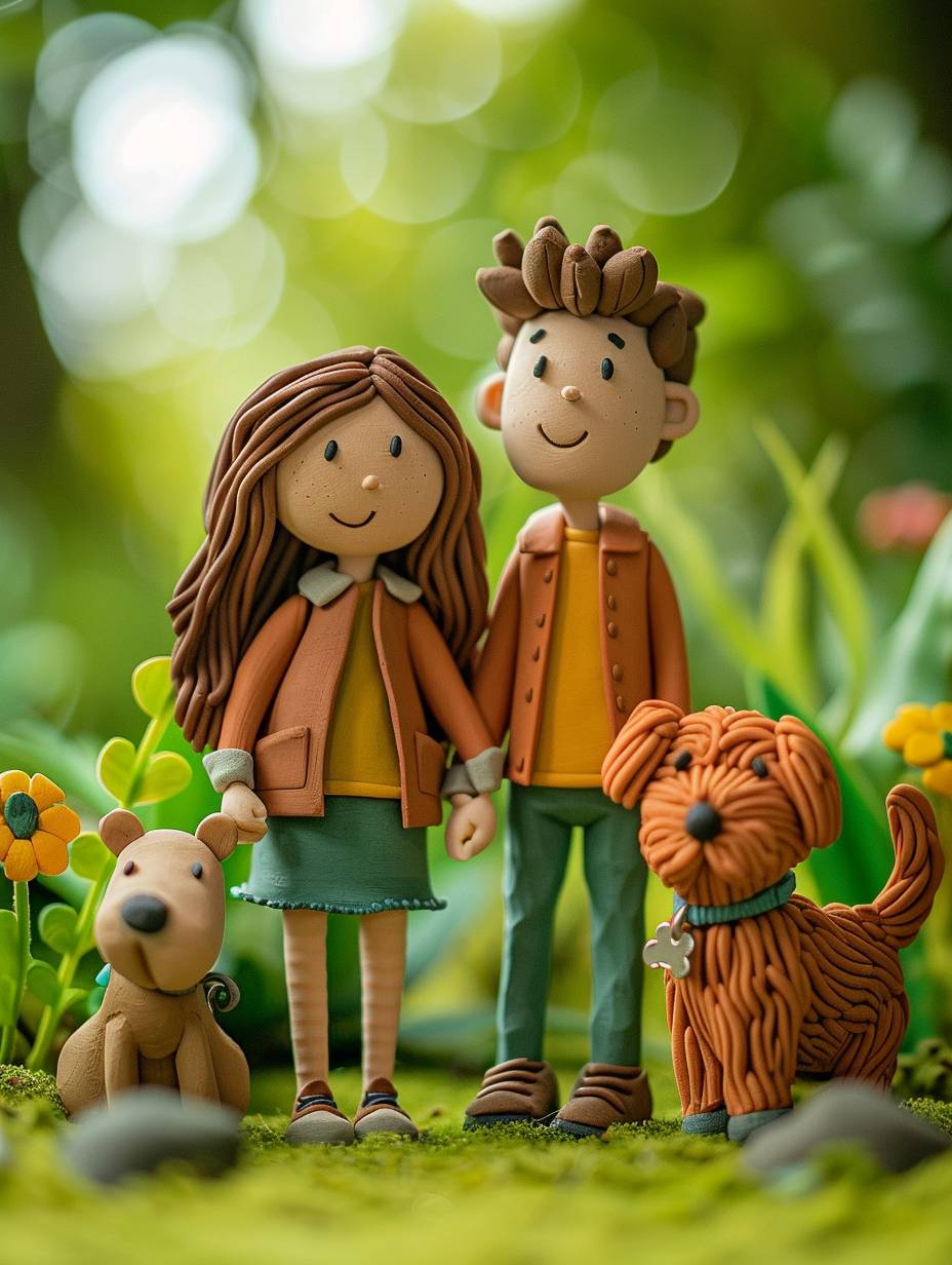 Cute young couple playing with their dog on the grass, casual, season is summer, objects and scenes are made of clay, with clay texture, stop motion style. --ar 3:4 --stylize 250 --v 6.0
