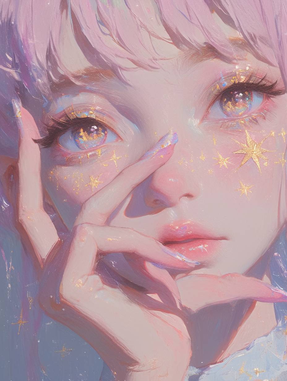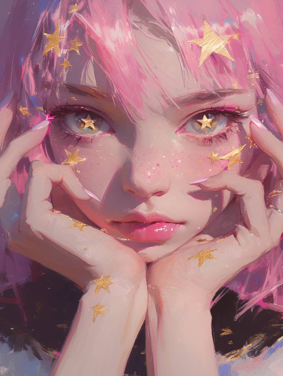 一位美麗女孩的特寫,粉紅色的頭髮和金色的眼睛。長長的睫毛,眼瞼上裝飾著金色的星星,嘴唇有淡淡的紅暈。她的手輕觸著臉龐,纖細的手指有著漂亮的長甲。使用柔和的色彩結合超現實主義的肖像風格和幻想插圖。虛幻的背景為可愛的卡通設計提供了支持,柔和地照亮了夢幻般的場景。數字藝術技術展示了高解析度下的細緻筆觸,呈現出幻想插畫家的風格。