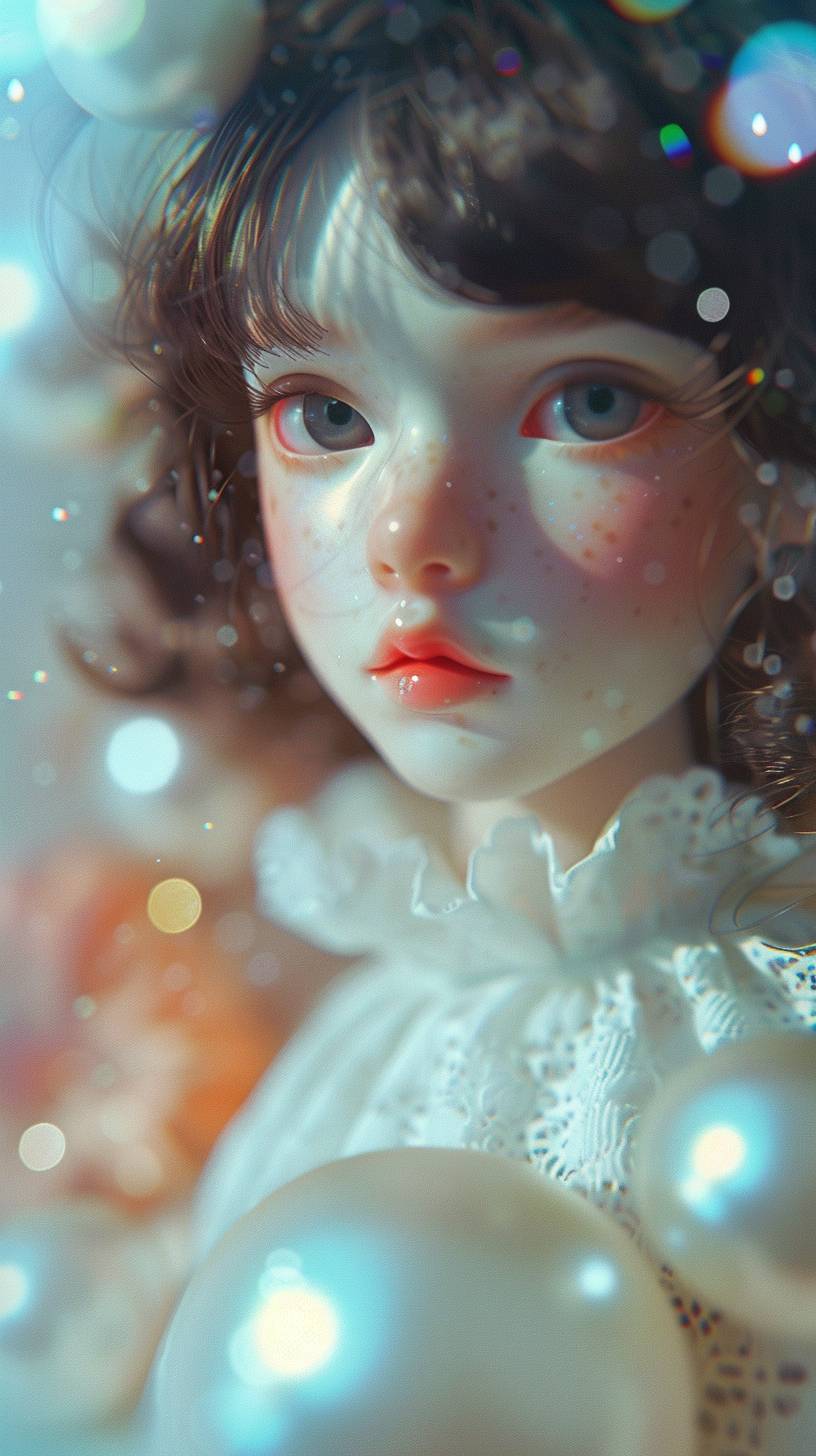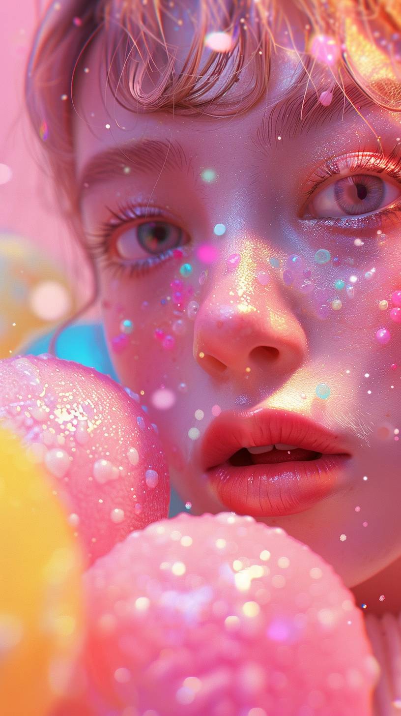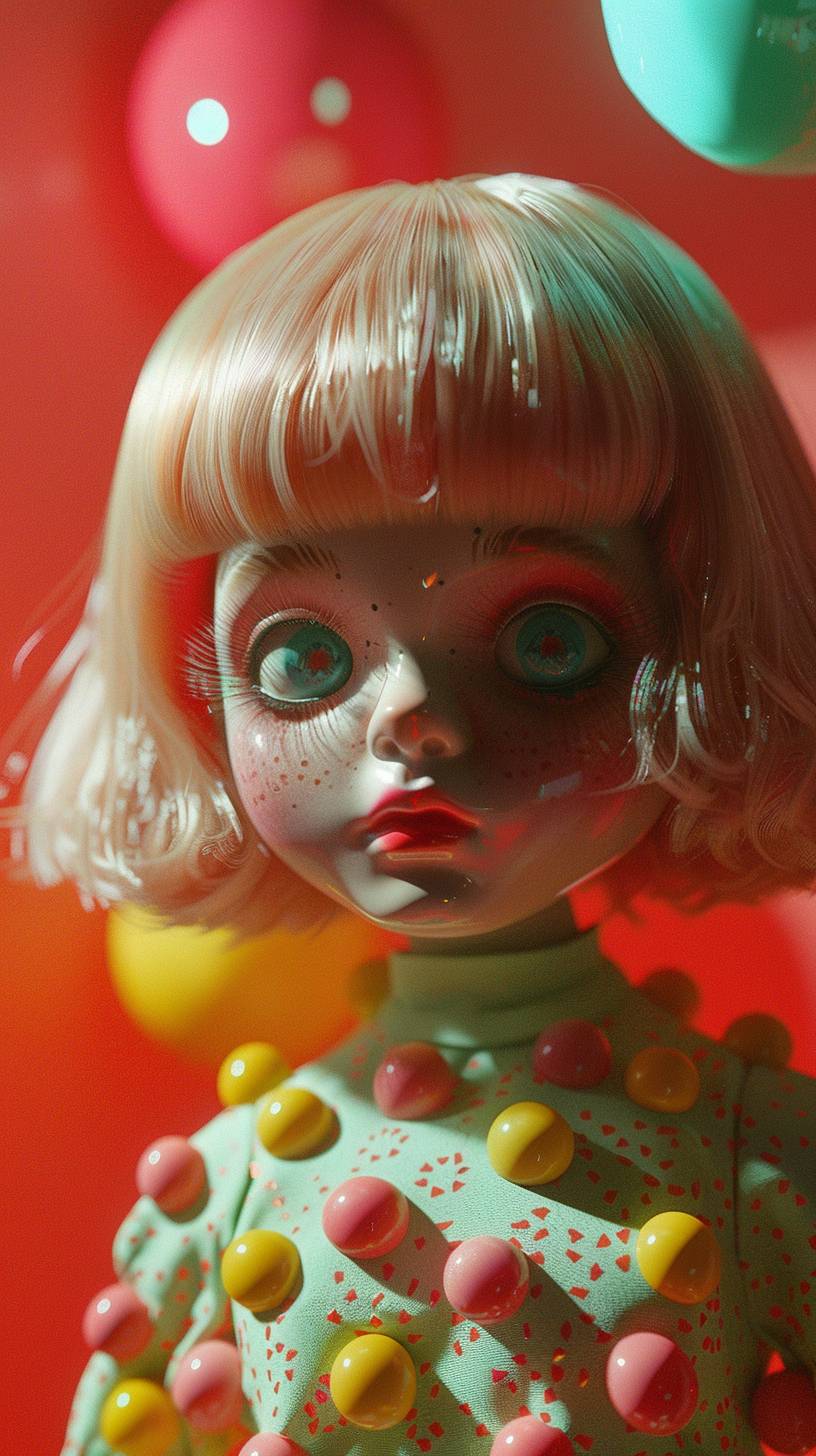 球形關節玩偶覆蓋著淡彩馬卡龍,短髮,大眼睛,紅唇,長睫毛,明亮的陽光,燈光,閃光粉,高分辨率,流行藝術,明亮,柔和的色彩,傾斜攝影::3,以電影靜態畫面的風格,漩渦光暈,作為全身照,對比強烈,Flickr,模擬,12mm,真實的,超真實的皮膚紋理和面部特徵,真實的身體和解剖結構,藝術光暈,鏡頭光暈,數碼單反::1 1.5::1