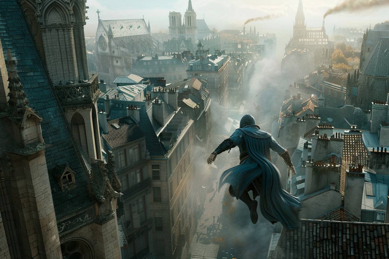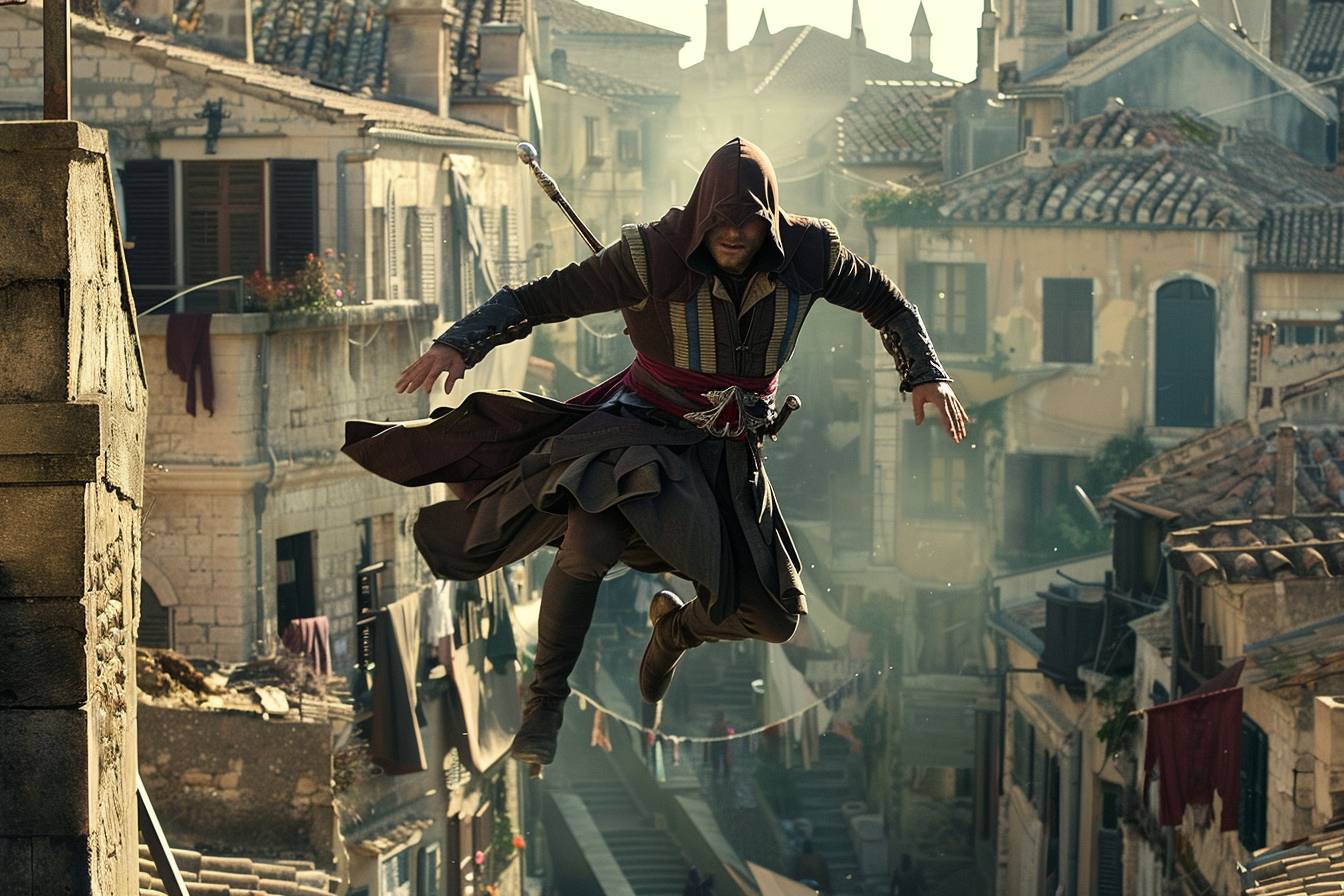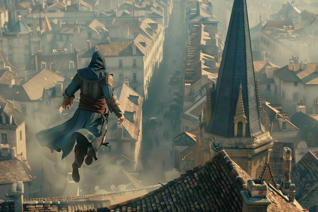 一名戴 hood 的刺客在中世紀城市的屋頂間靈活跳躍。