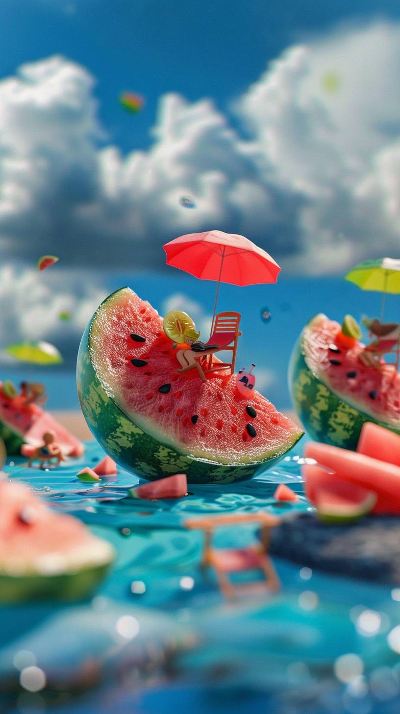 西瓜在空中漂浮,卡通風格的迷你世界,高解析度和高細節,超精緻的攝影,背景色彩明亮,可愛,夢幻,充滿夏日氣息的手機壁紙。西瓜片游泳池配有椅子和陽傘,小人物在藍色海洋的背景下放鬆。