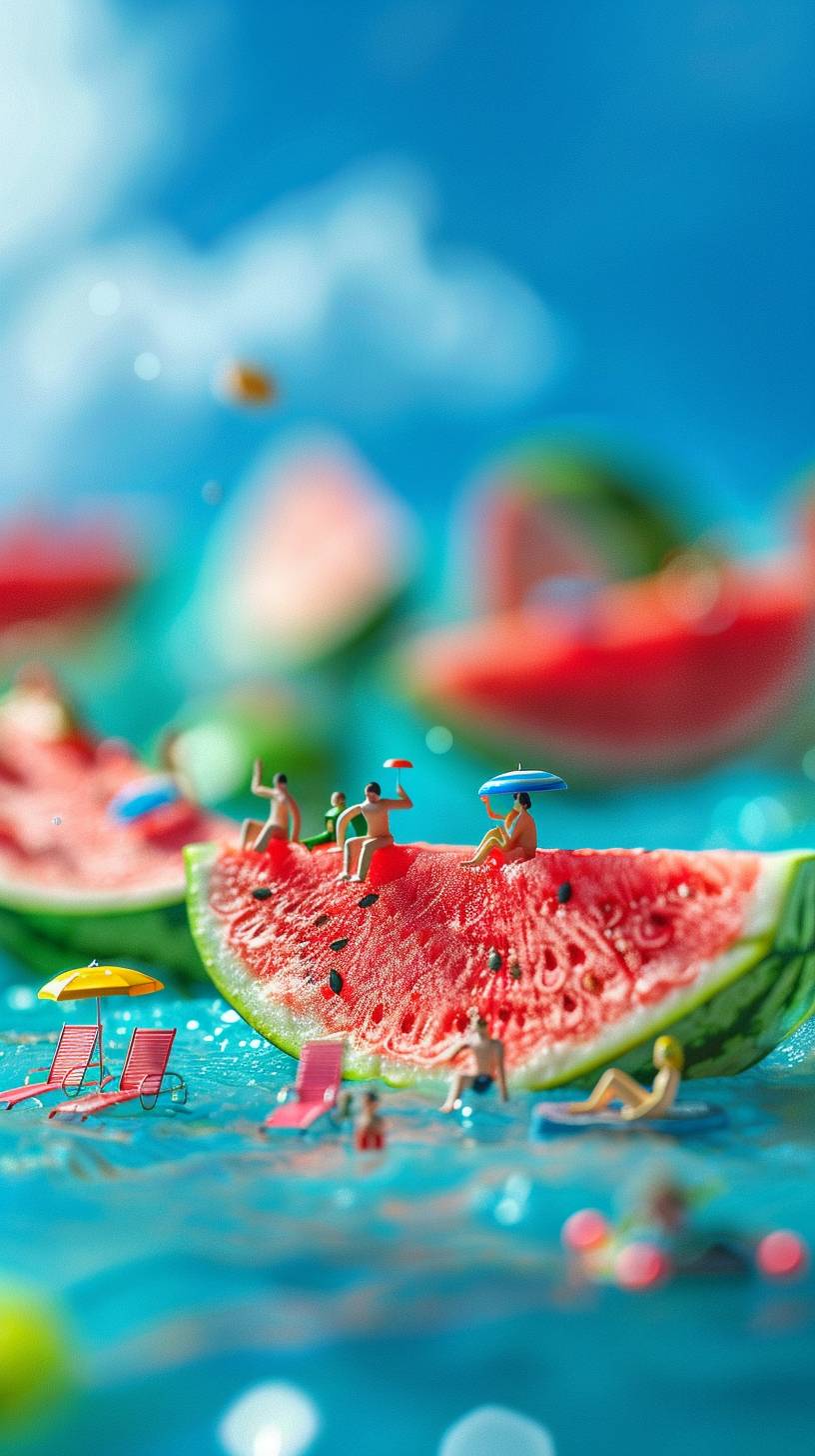 Watermelon floating in the air, cartoon-style miniature world, high resolution and high detail, super-fine photography with bright background colors, cute, dreamy, summer-filled mobile wallpaper. Watermelon slice pool with chairs and parasols, small figures relaxing against the background of the blue ocean. --ar 9:16 --v 6.0