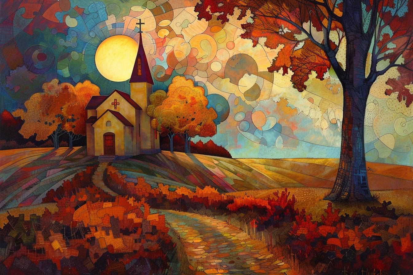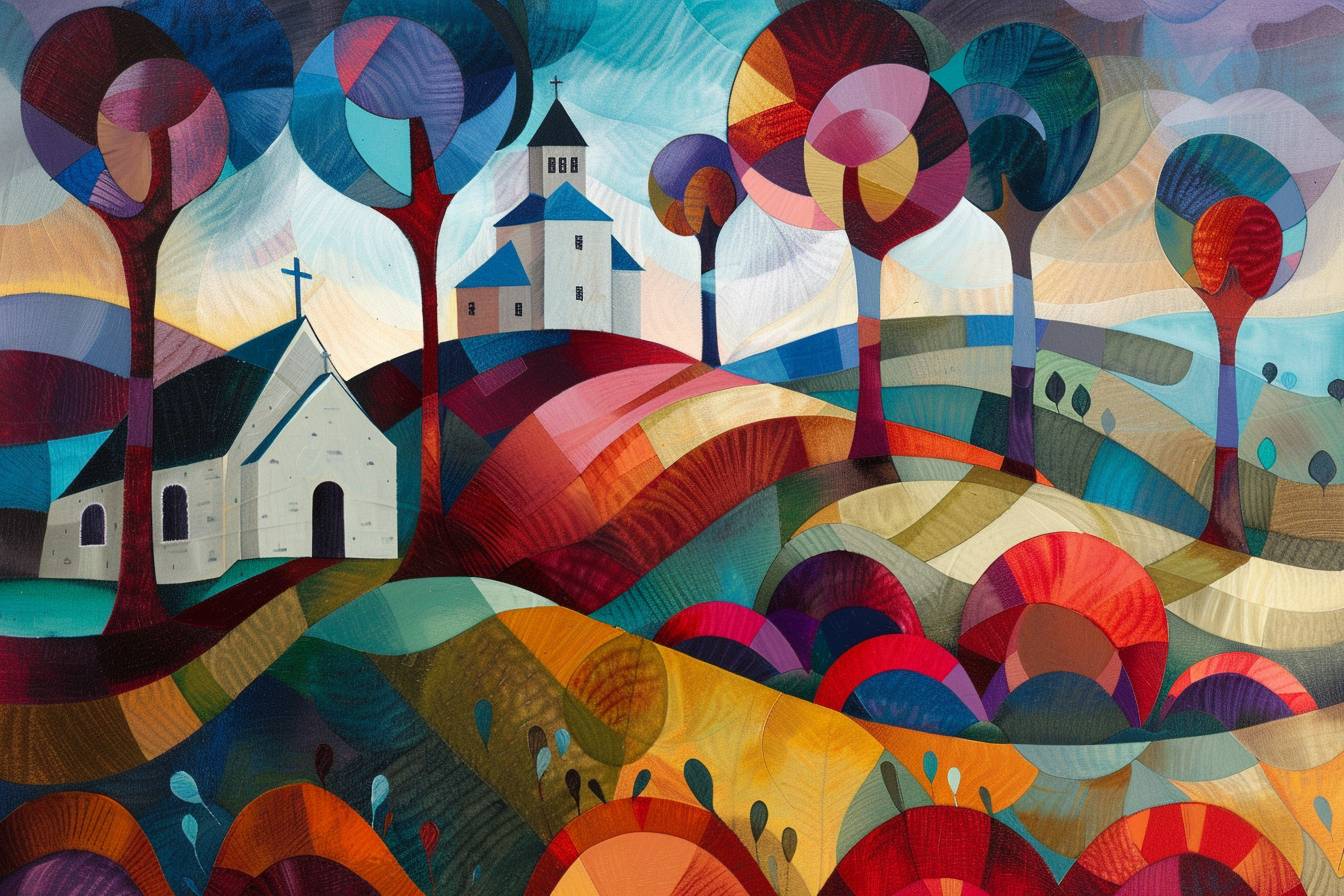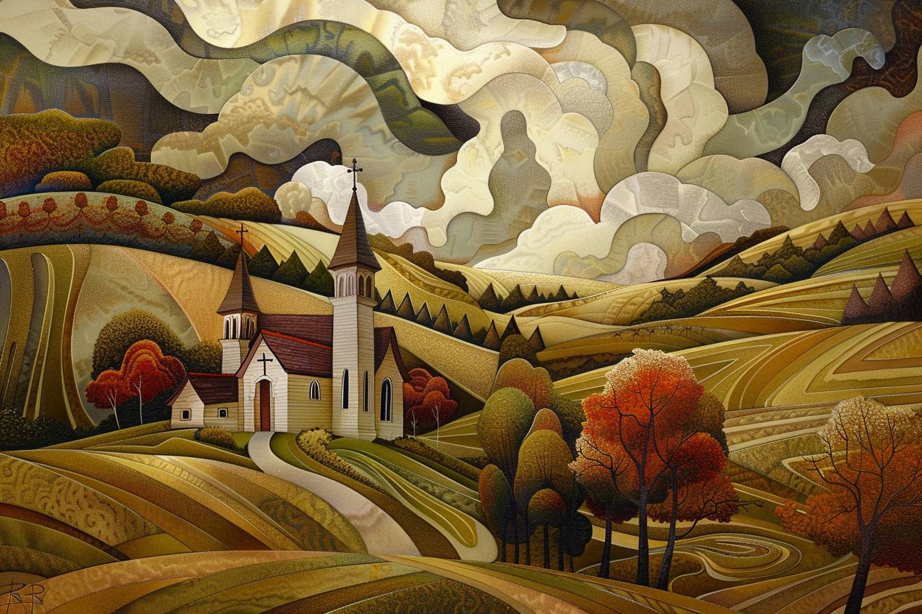 in style of Keith Mallett, stunning natural landscape, church --ar 3:2 --v 6.0