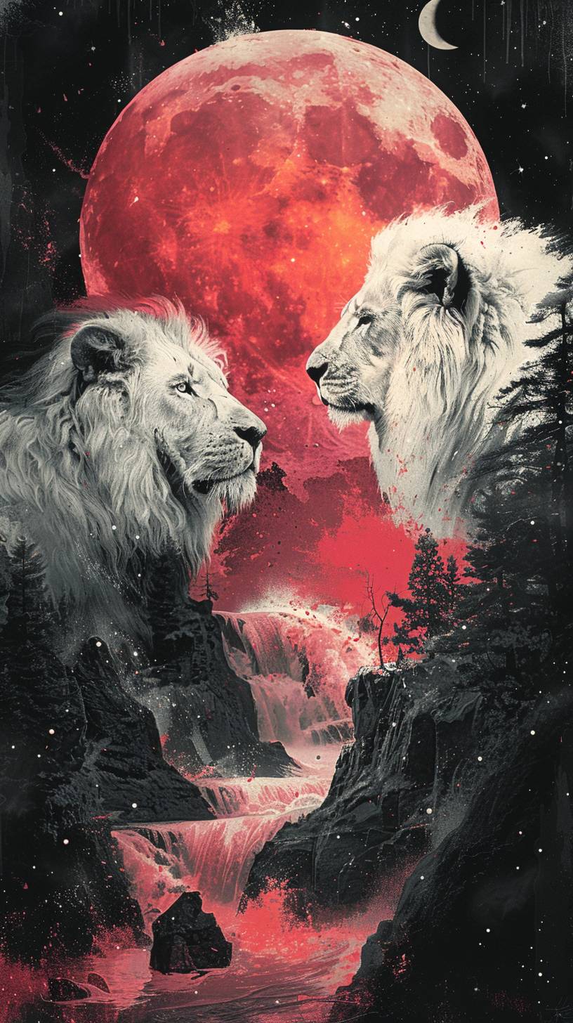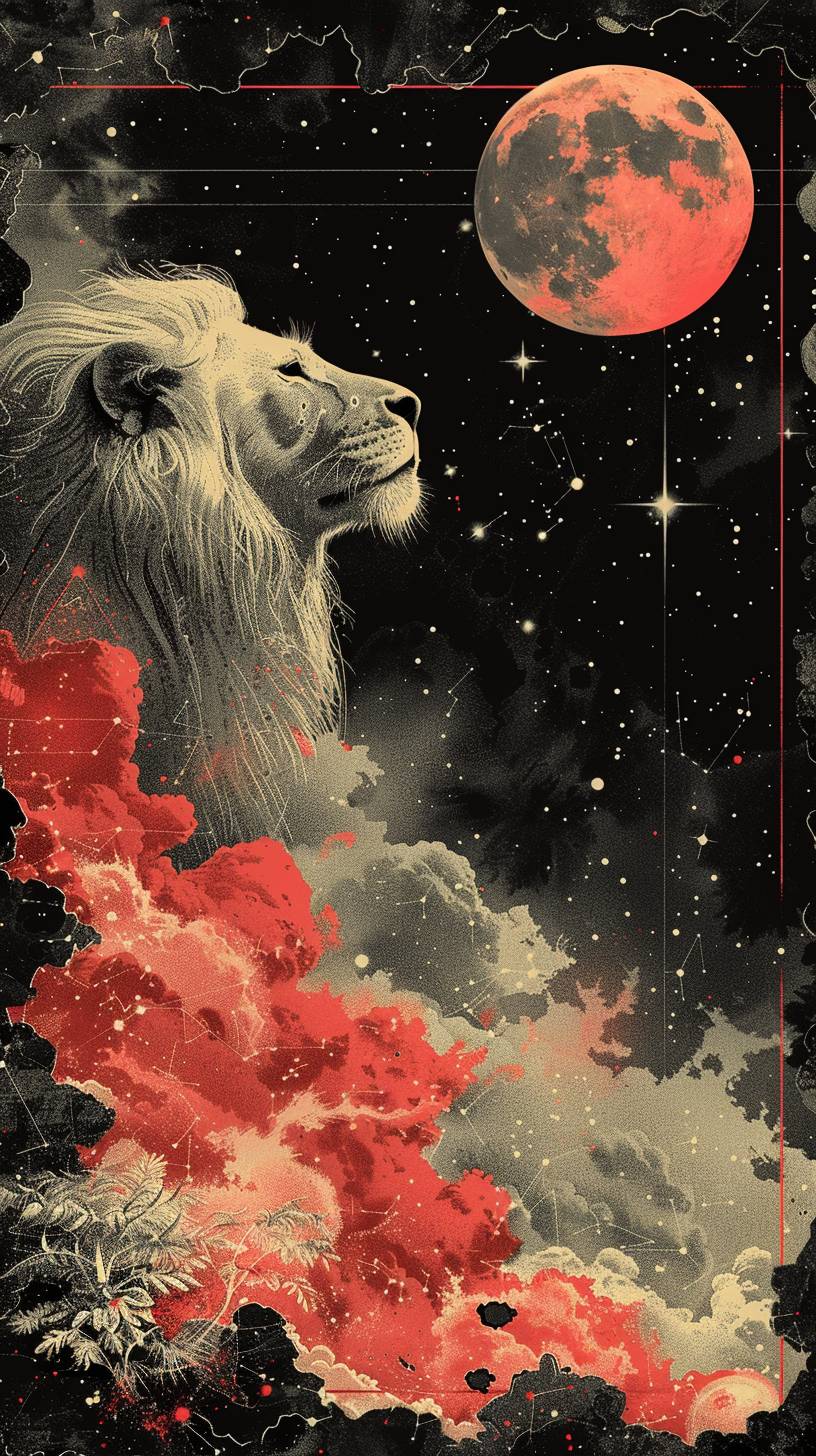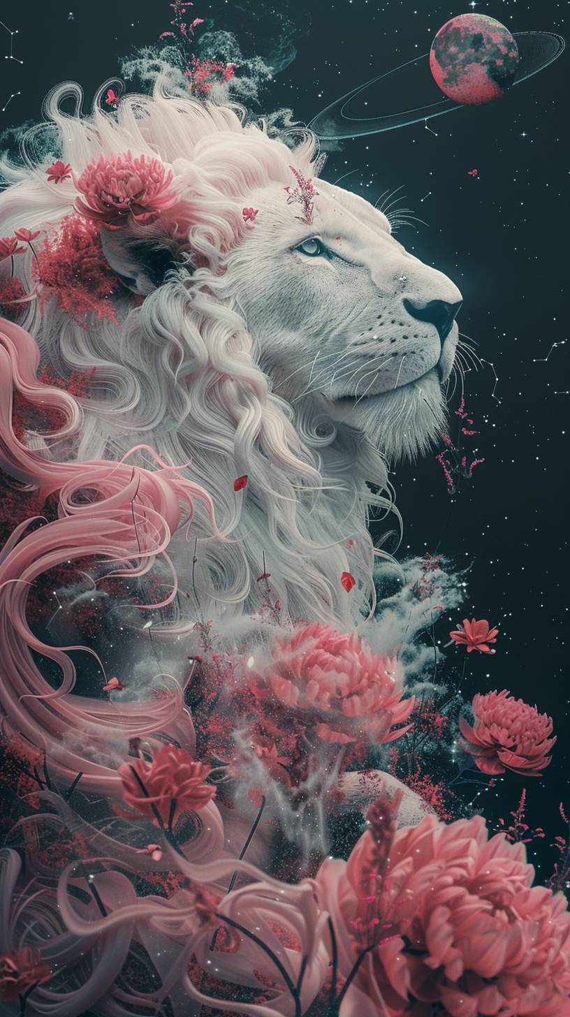 pink and white a mermaid and a lion on planet, outer space scene on a background with zodiac stars, ethereal geometry, black and white mastery, witchcore, massurrealism, fairycore --ar 9:16 --stylize 750 --v 6.0