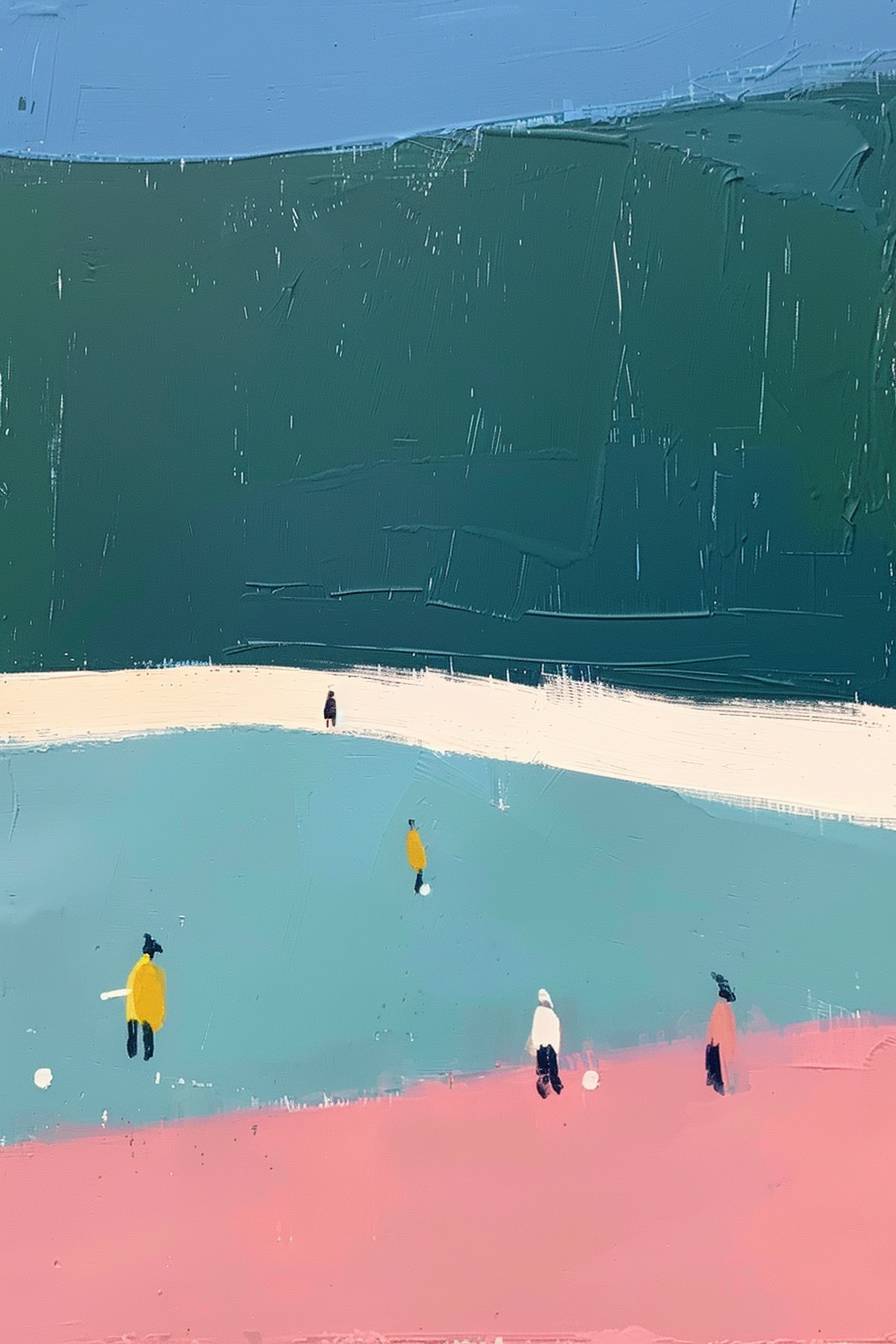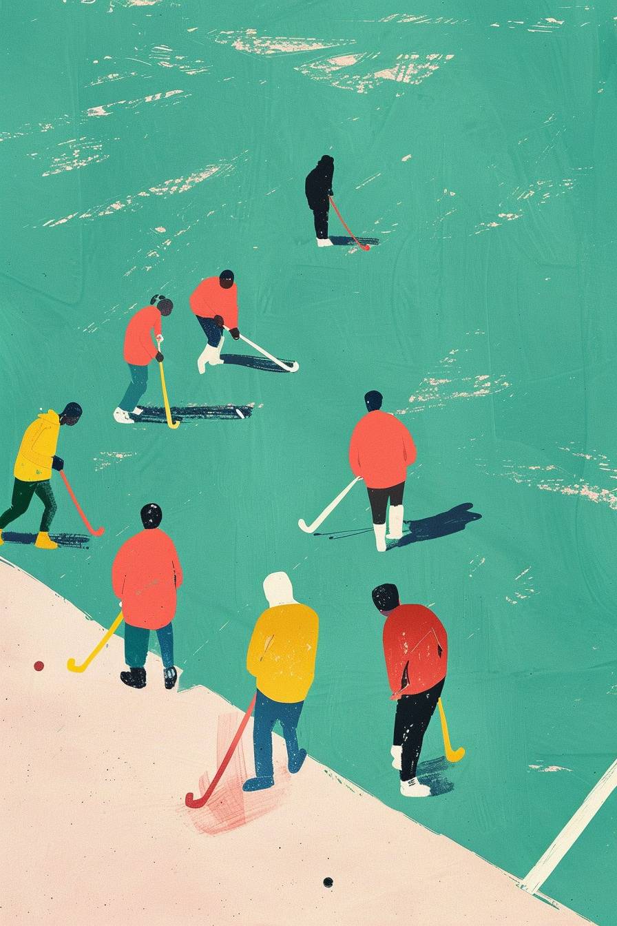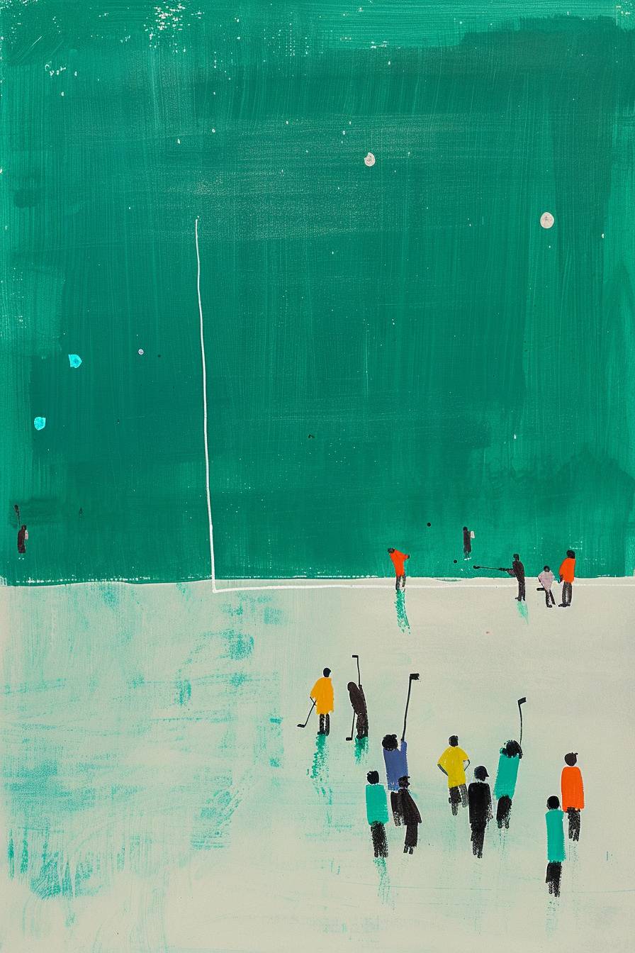 simplistic and minimal, people on a field hockey pitch, art, gauche, in the style of etel adnan --ar 2:3 --v 6.0