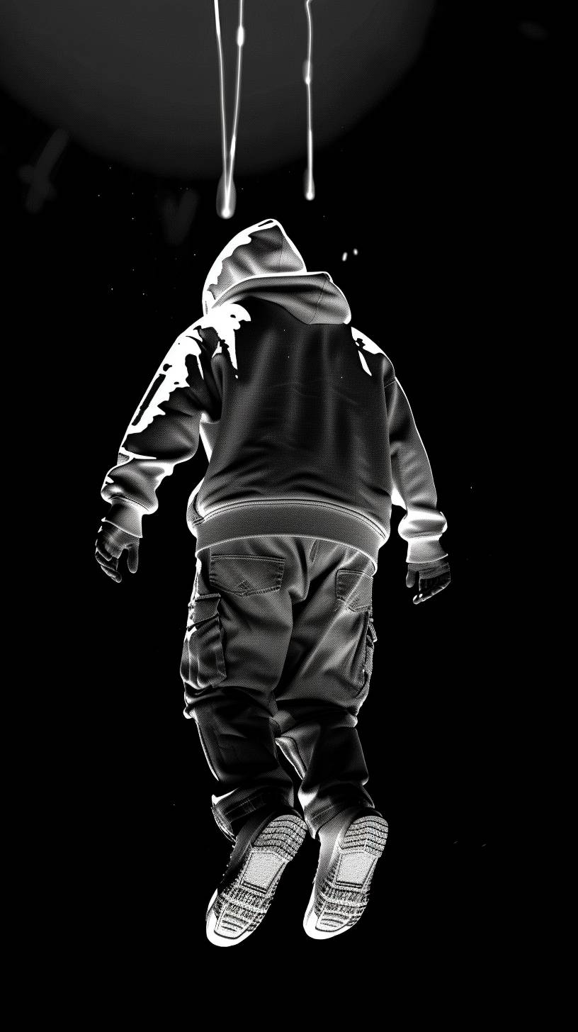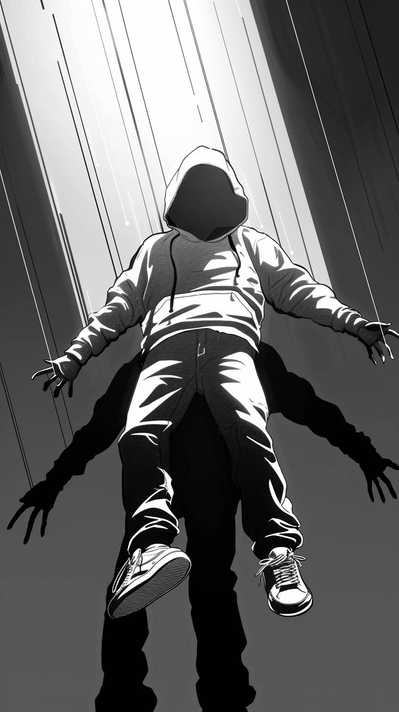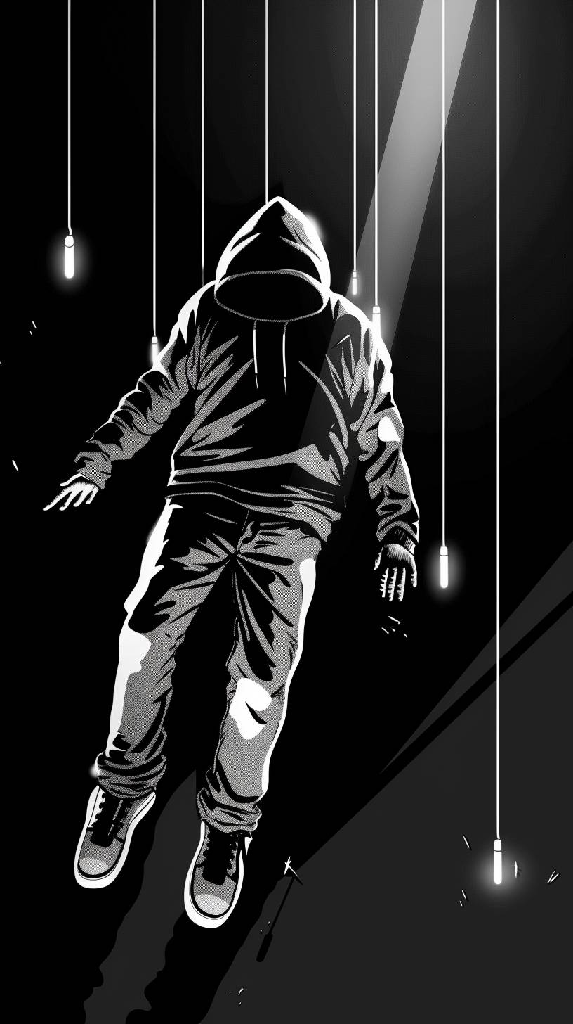 men wearing hoodie floating in the air pierced by 5 laser beam, black and white, bruce timm cartoon animation, high contrast, --ar 9:16 --stylize 50 --v 6.0