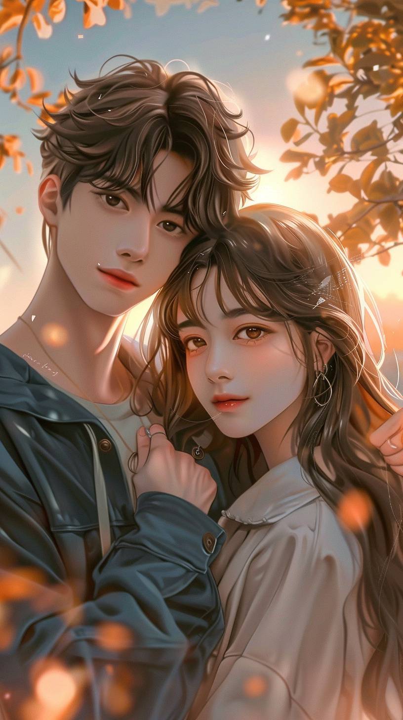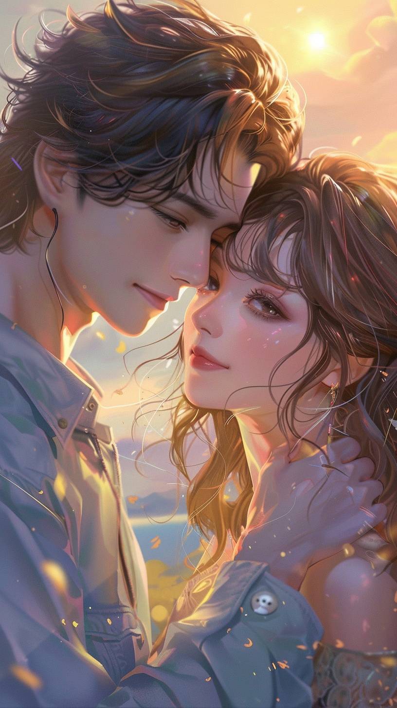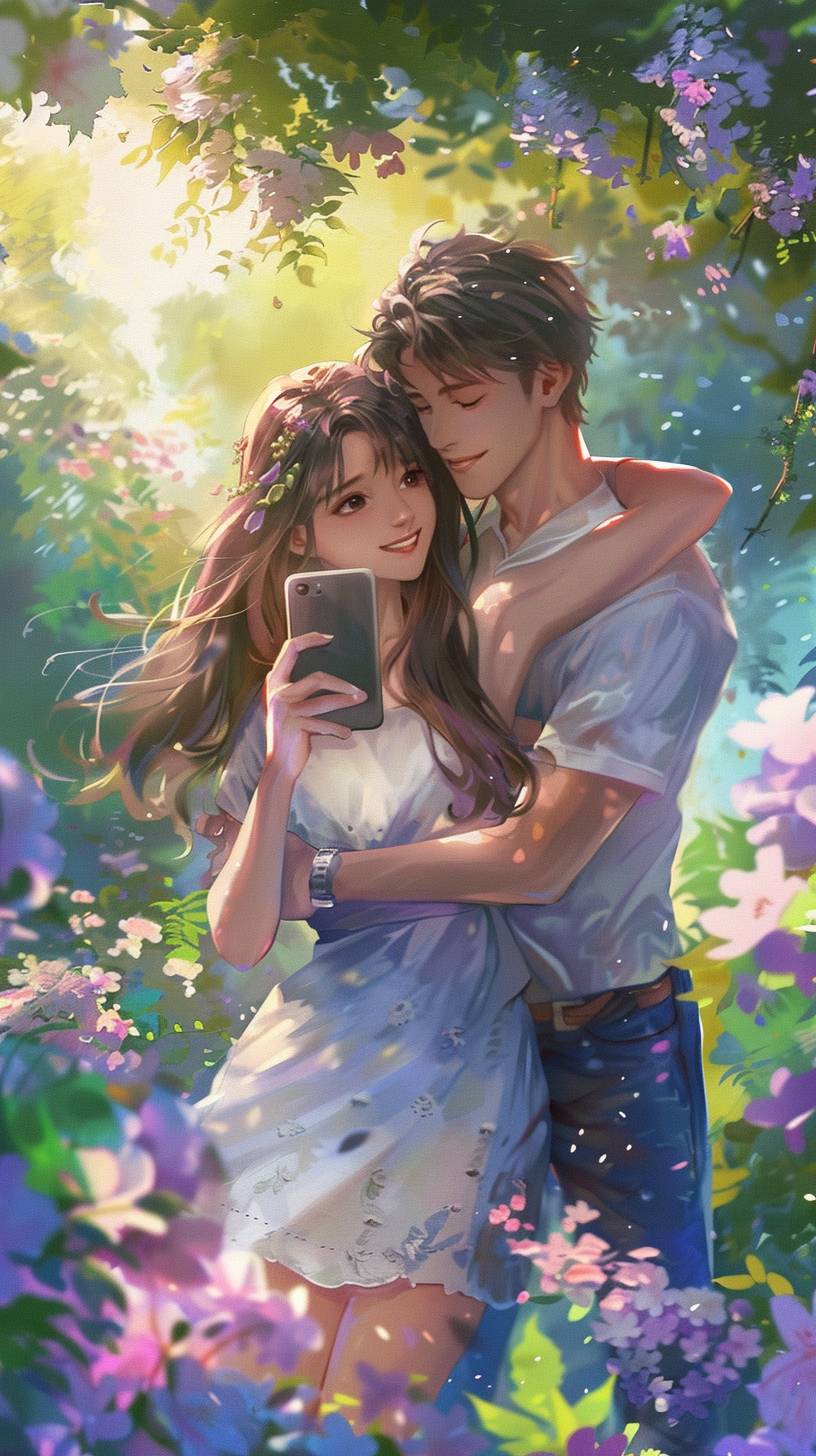 a lovely couple anime style, hugging, standing in beautiful scenery a girl long brown hair, and guy short hair, taking a couple selfie cute pose cheeks together, masterpiece, romantic atmosphere hd quality, --ar 9:16 --v 6.0