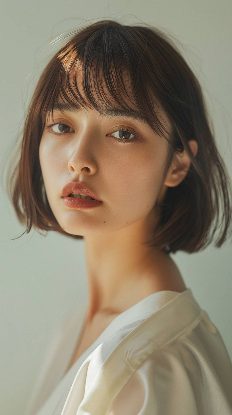 8K, RAW photo, best quality, haircut photo, one beautiful Japanese woman, ennui, natural light, 30 years old, close-up, high tone ash brown, short straight hair, with bangs, smoky ivory, white tunic, light makeup, light brown brows, realistic skin texture, Light gray background, Sony a7R IV, Leica 11678, f9, --ar 9:16 --stylize 90 --v 6.0