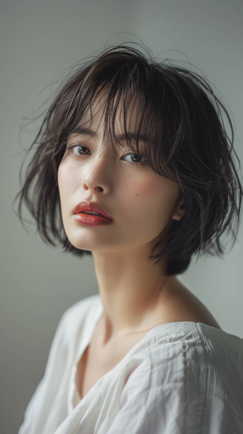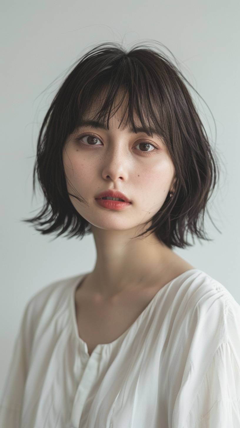 一位美麗的日本女性,30歲,短直髮,帶劉海,淡灰色背景,穿著白色長 tunic,淡妝,淺棕色眉毛,皮膚質感真實,使用自然光,表現出一種無聊的神情。