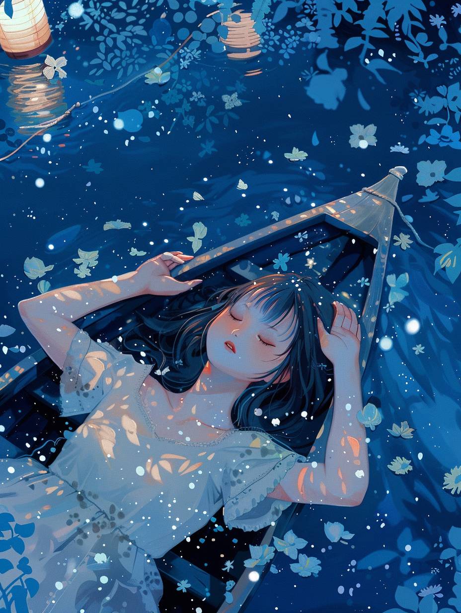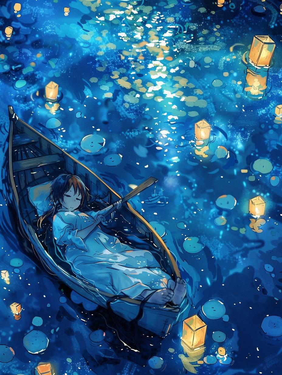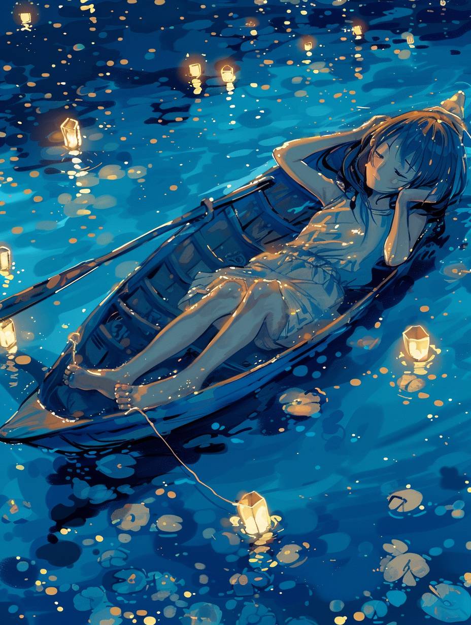 一個可愛的女孩躺在小船上,風格類似於宮崎駿,清澈的水面。使用簡單的藍色調,呈現日本動漫卡通風格。這是一幅上半身肖像,細節精緻。在午夜時分,水面反射著星光和天燈。
