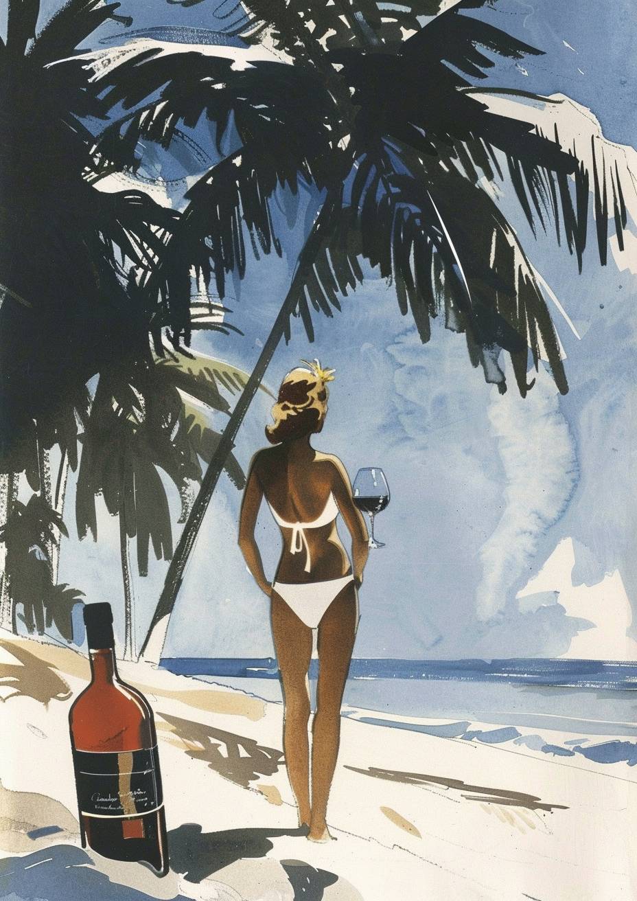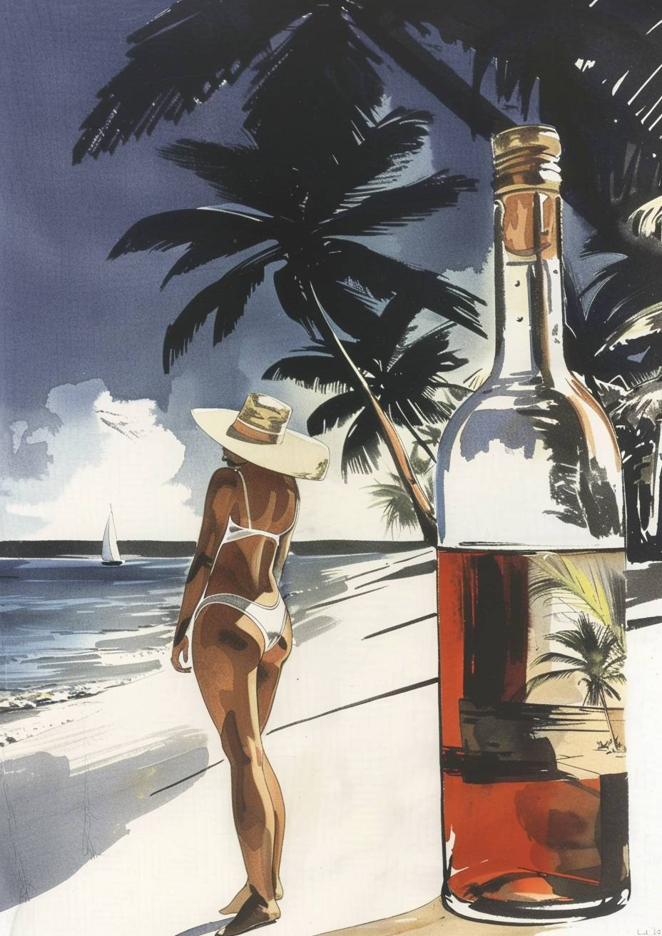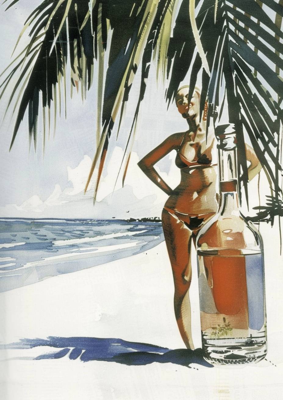 一瓶裝著熱帶海灘和美麗泳衣模特的圖像,採用數字處理風格。