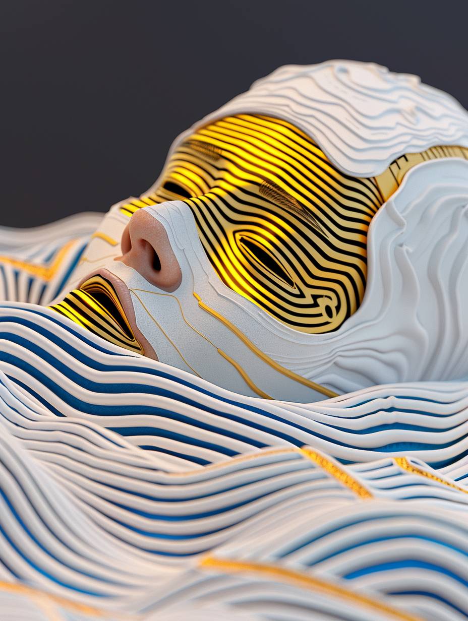 A woman in white with a gold mask lies on top of the blue waves, in the style of Iris van Herpen. The futuristic, hyper realistic, surrealistic landscape has a dark navy background with a blue and yellow gradient color palette and golden hour lighting from a low angle shot. The octane render and 3D rendering are hyper detailed and hyper realistic with dramatic octance rendering. --chaos 20 --ar 3:4 --style raw --personalize lmho356 --stylize 1000 --v 6.0