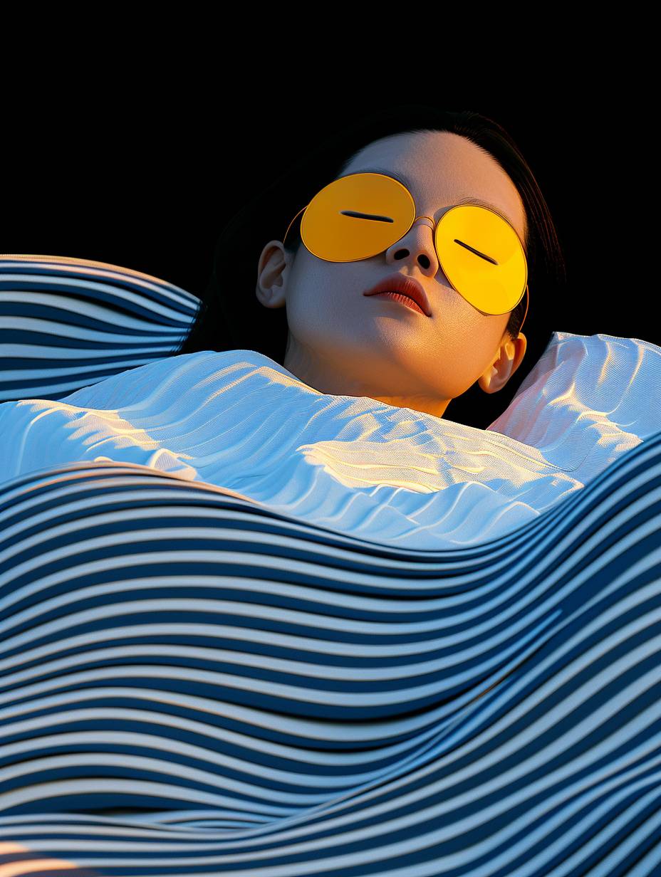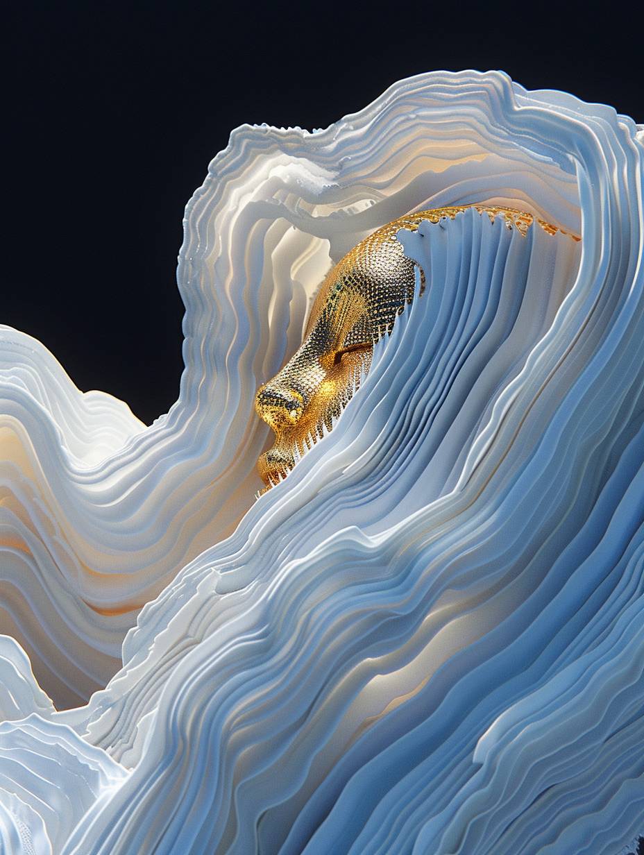 一位身穿白衣、佩戴金色面具的女性躺在藍色波浪上,靈感源自Iris van Herpen的風格。這個未來主義、超現實的景觀背景為深海軍藍,配有藍色與黃色的漸變色調,以及來自低角度拍攝的金色時光照明。八角渲染和三維渲染非常細緻且逼真,呈現出戲劇性的八角渲染效果。