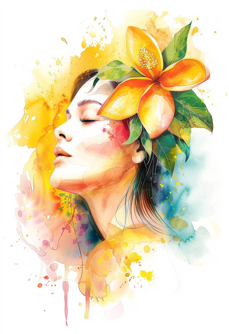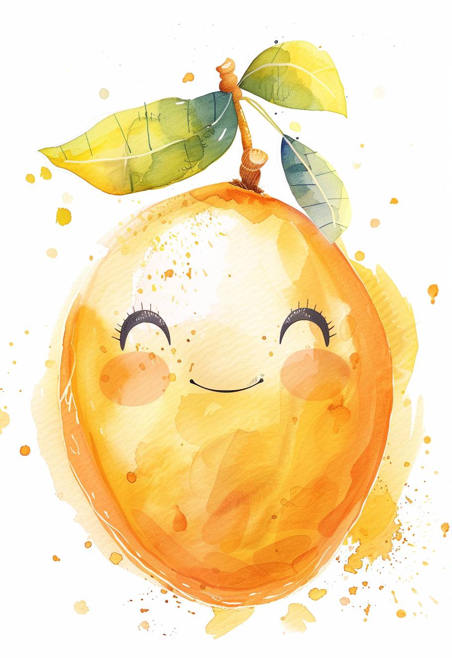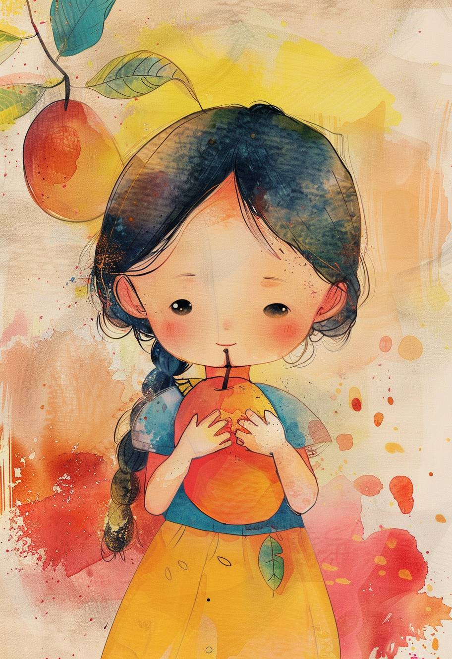 創建一幅美麗的芒果少女的皮克斯水彩插圖,背景有紋理,使用淡色,展示完整的畫面,沒有裁剪。
