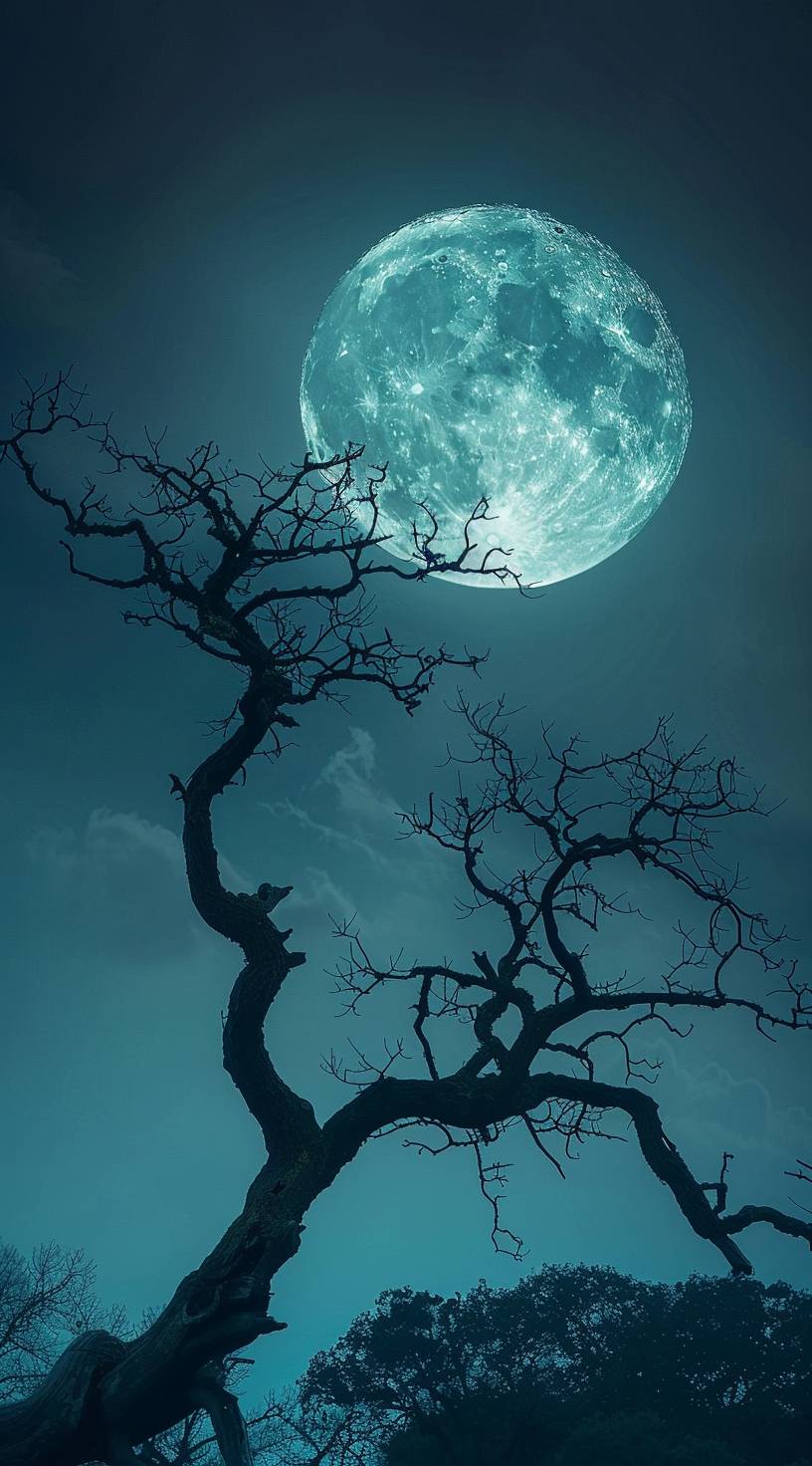 The moon is in the sky, and there's only one branch of an ancient tree with no leaves on it. The background color should be blue gradient. High definition photography --ar 71:128 --v 6.0