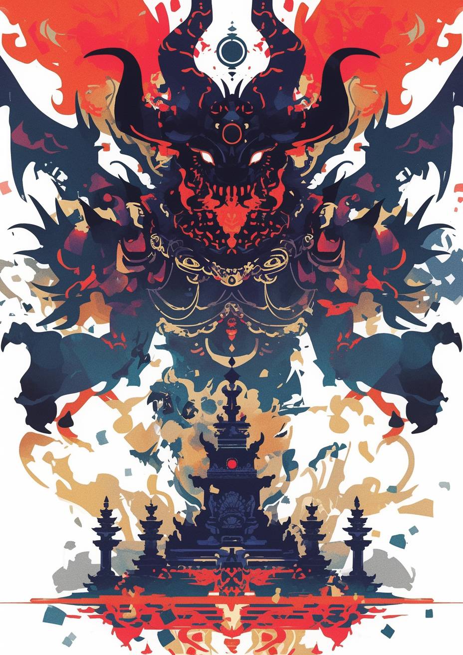 a book cover illustration in folk horror style, with bold lines and flat colours, a Hindu demon in dark silhouette, Prambanan Temple Yogyakarta, crimson red, obsidian black, silver white --ar 5:7 --stylize 250 --niji 6
