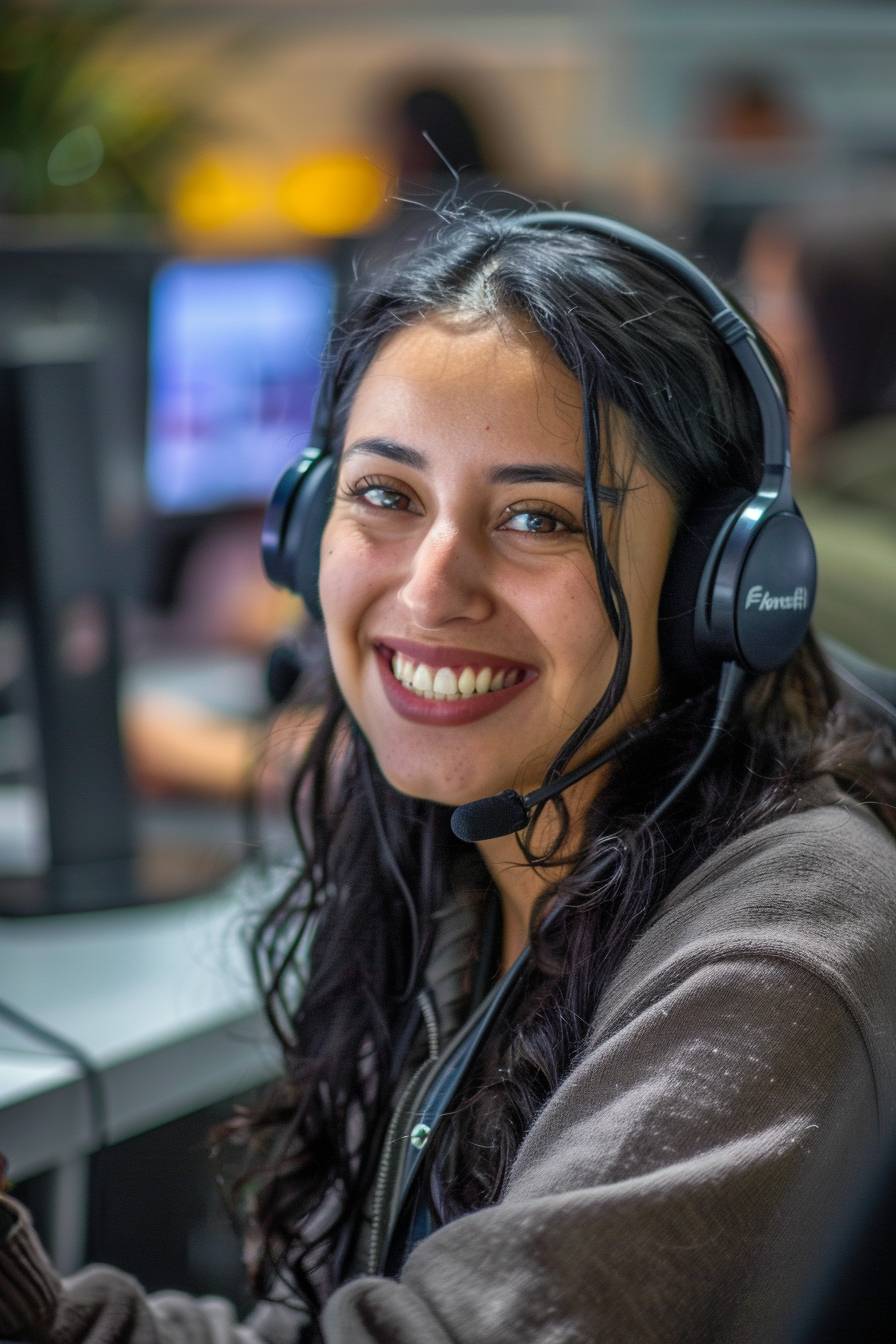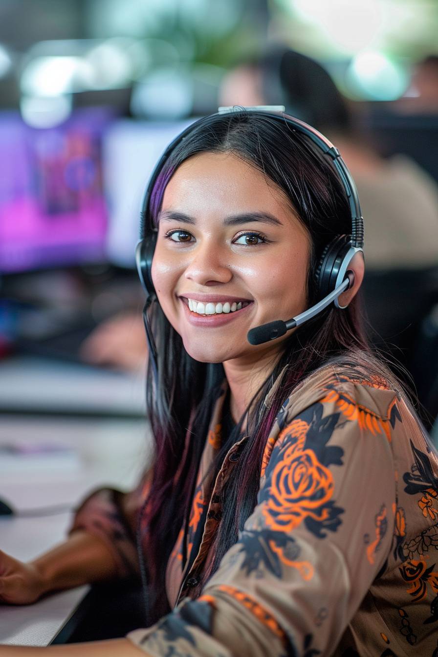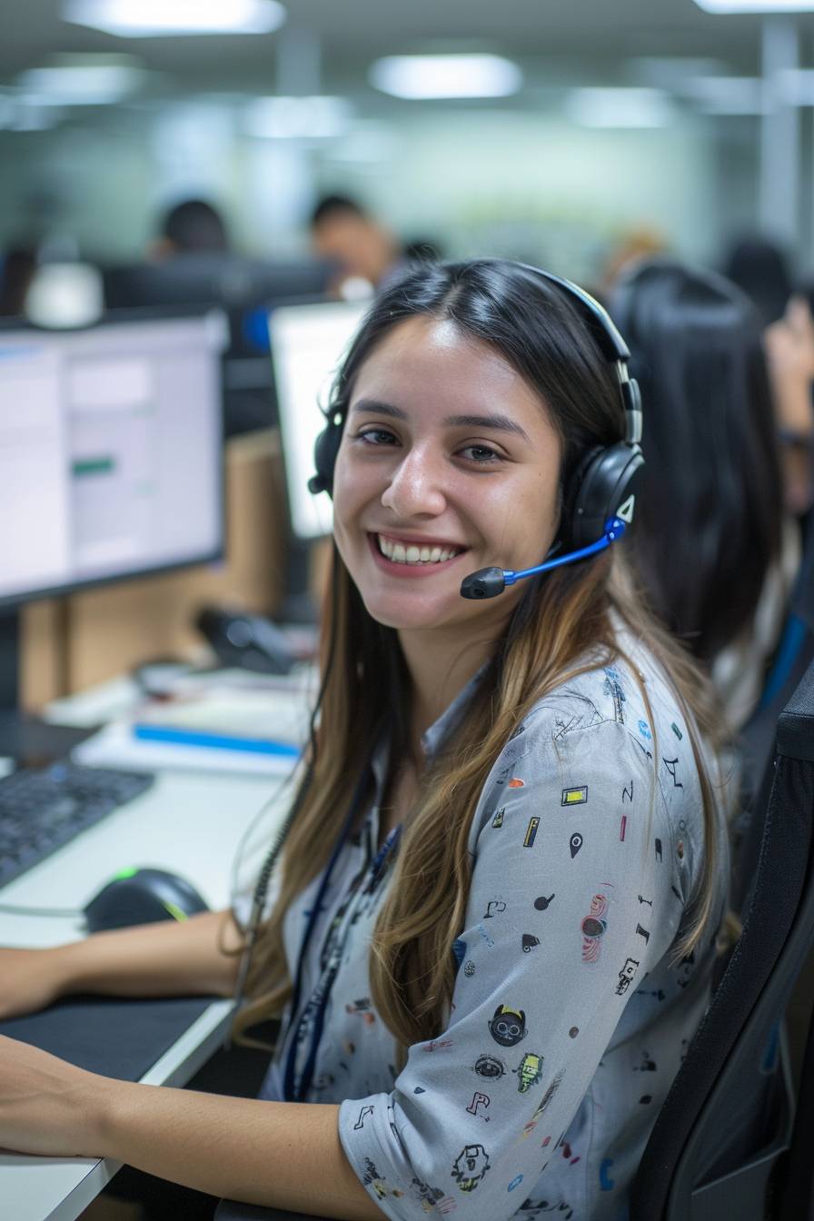 facebook ad for the south america about work in a call center with a smiling operator in --ar 2:3 --v 6.0
