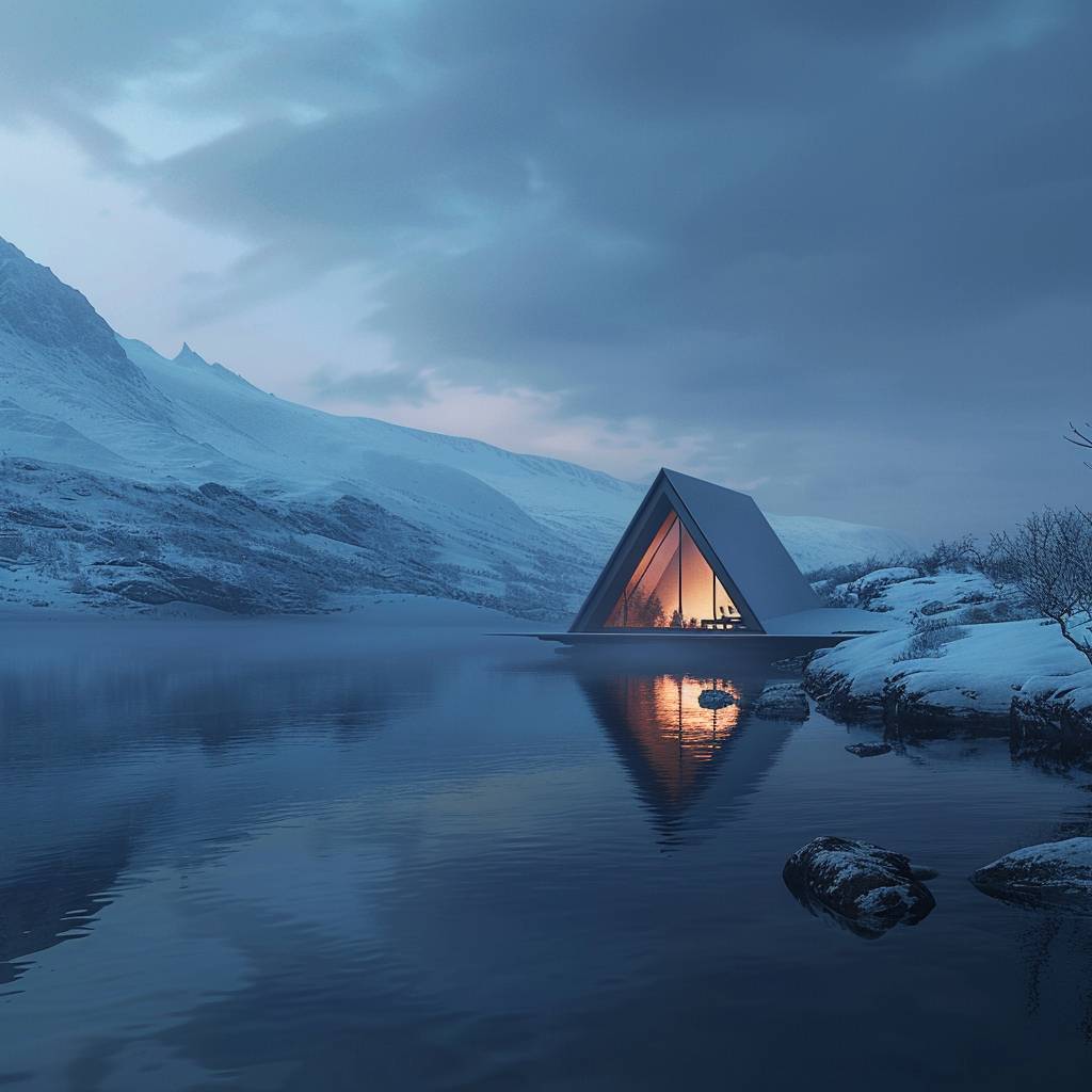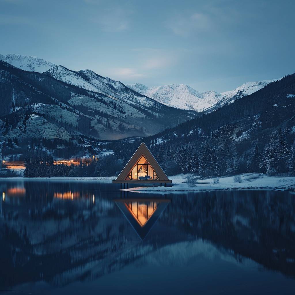 Envision a tranquil scene where a solitary triangular cabin with a warm, glowing interior sits at the edge of a calm, reflective lake. The scene is set in the deep twilight of a winter evening, with the surrounding landscape blanketed in snow. Steep, snow-covered mountains loom in the background, enhancing the isolation and serene beauty of the cabin. The sky is a deep shade of blue, indicating the late hour, and the cabin's reflection on the water creates a symmetrical image of warmth in the cold environment --v 6.0