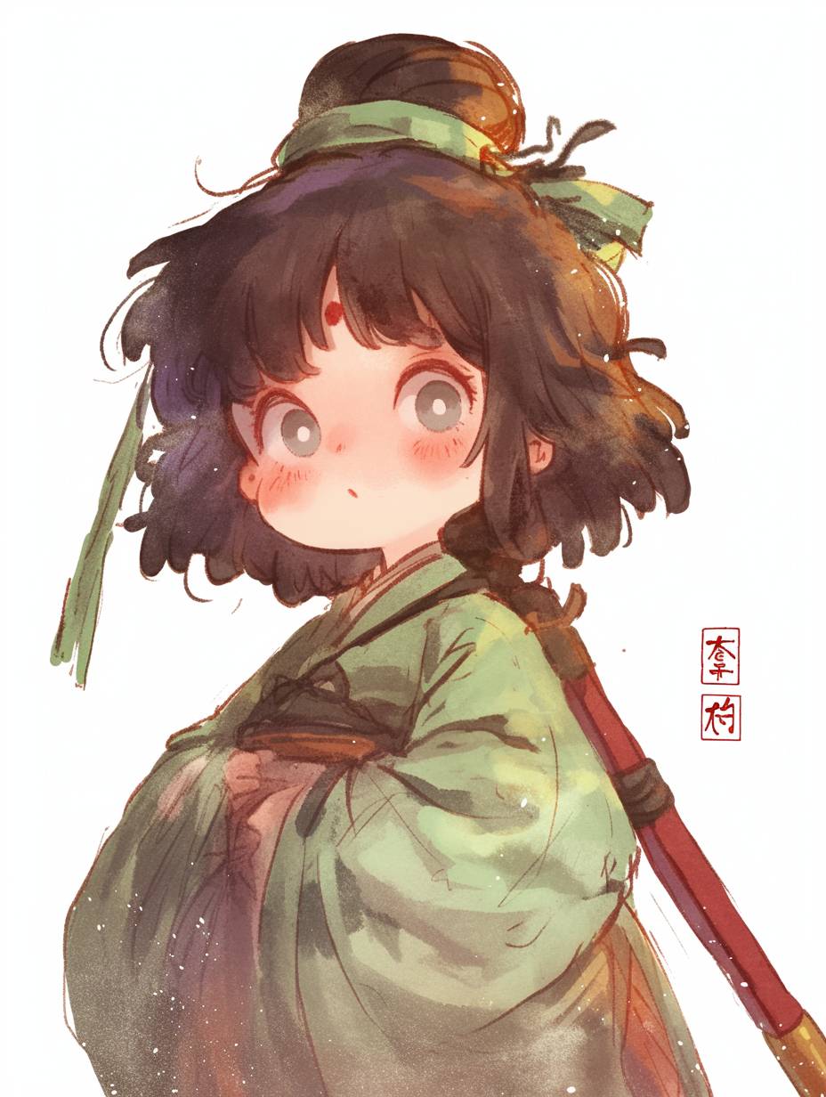 唐朝小女孩,古代中國可愛的卡通士兵形象,肥胖風格,中國水墨淡色,絨毛刷筆觸,淺紅色和黑色,點綴綠色,手勢標記,誇張的漫畫表情,超詳細細節,極簡主義